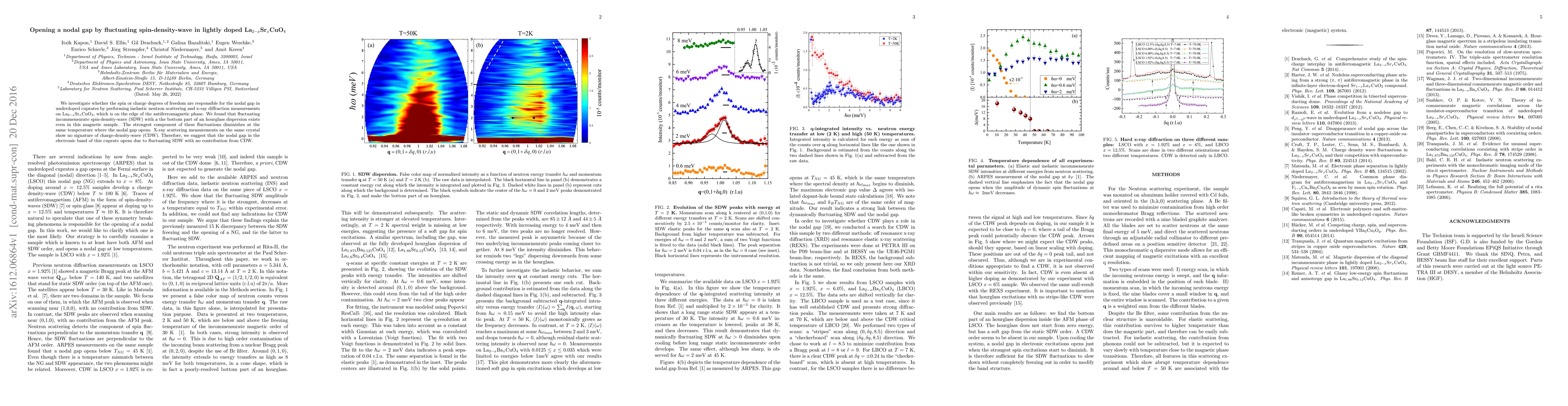This study reveals that fluctuating spin-density-wave (SDW) rather than charge-density-wave (CDW) is responsible for the nodal gap in lightly doped La$_{2-x}$Sr$_x$CuO$_4$, using neutron scattering and x-ray diffraction. The SDW fluctuations diminish as the nodal gap opens, indicating their role in the gap formation.