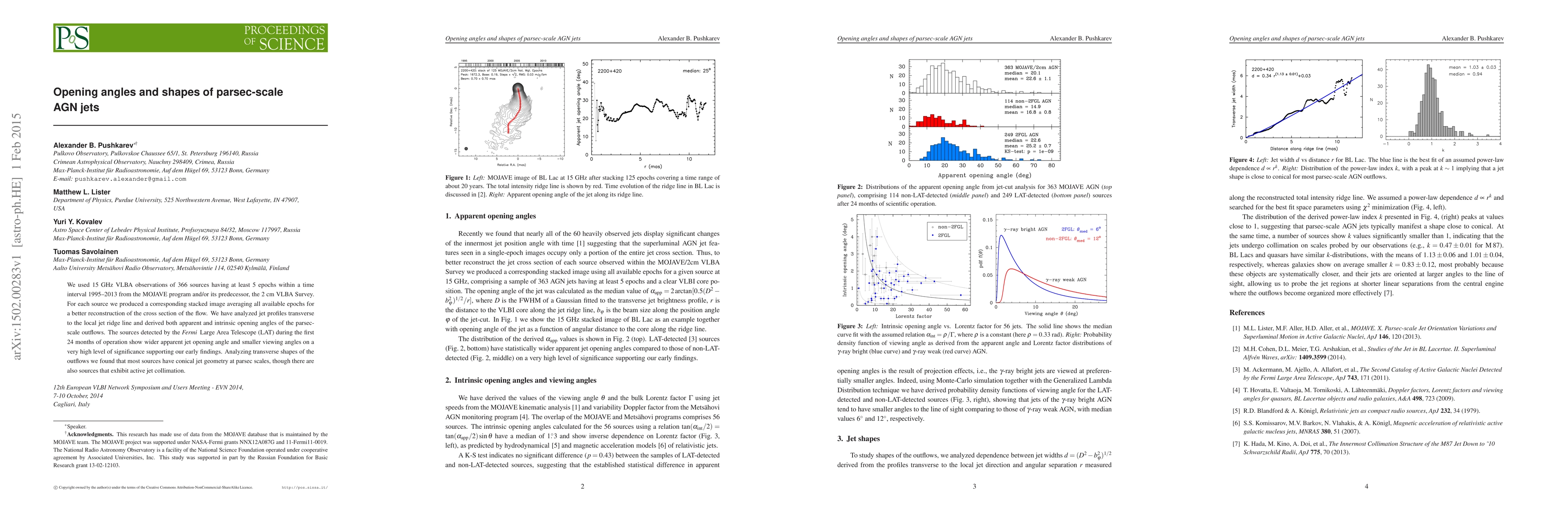 This study uses 15 GHz VLBA observations to analyze the opening angles and shapes of 366 AGN jets, revealing that most exhibit a conical geometry. Jets detected by the Fermi LAT show wider apparent opening angles, supporting earlier findings.
