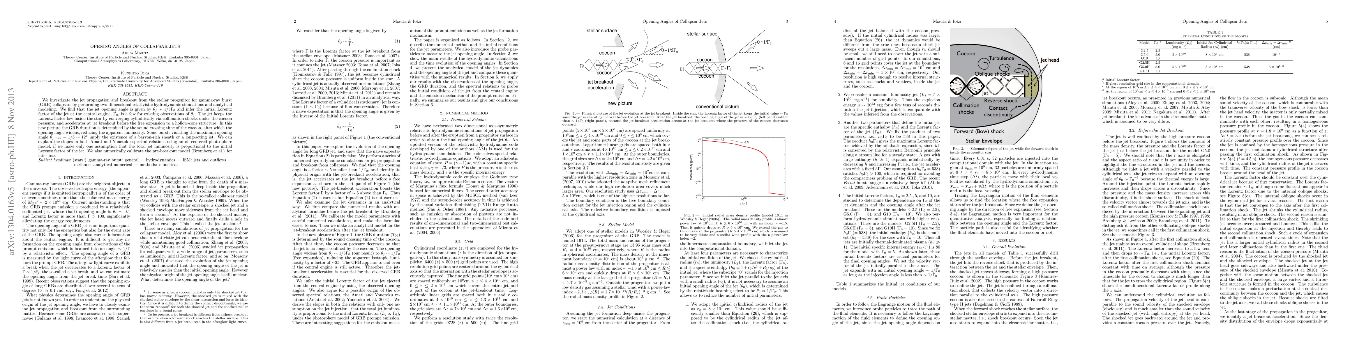 We investigate the jet propagation and breakout from the stellar progenitor for gamma-ray burst (GRB) collapsars by performing two-dimensional relativistic hydrodynamic simulations and analytical modeling. We find that the jet opening angle is given by $\theta_j \sim 1/5 \Gamma_{0}$, and infer the initial Lorentz factor of the jet at the central engine, $\Gamma_0$, is a few for existing observations of $\theta_j$. The jet keeps the Lorentz factor low inside the star by converging cylindrically via collimation shocks under the cocoon pressure, and accelerates at jet breakout before the free expansion to a hollow-cone structure. In this new picture the GRB duration is determined by the sound crossing time of the cocoon, after which the opening angle widens, reducing the apparent luminosity. Some bursts violating the maximum opening angle $\theta_{j,\max}\sim 1/5 \sim 12^{\circ}$ imply the existence of a baryon-rich sheath or a long-acting jet. We can explain the slopes in both Amati and Yonetoku spectral relations using an off-centered photosphere model, if we make only one assumption that the total jet luminosity is proportional to the initial Lorentz factor of the jet. We also numerically calibrate the pre-breakout model (Bromberg et al.) for later use.