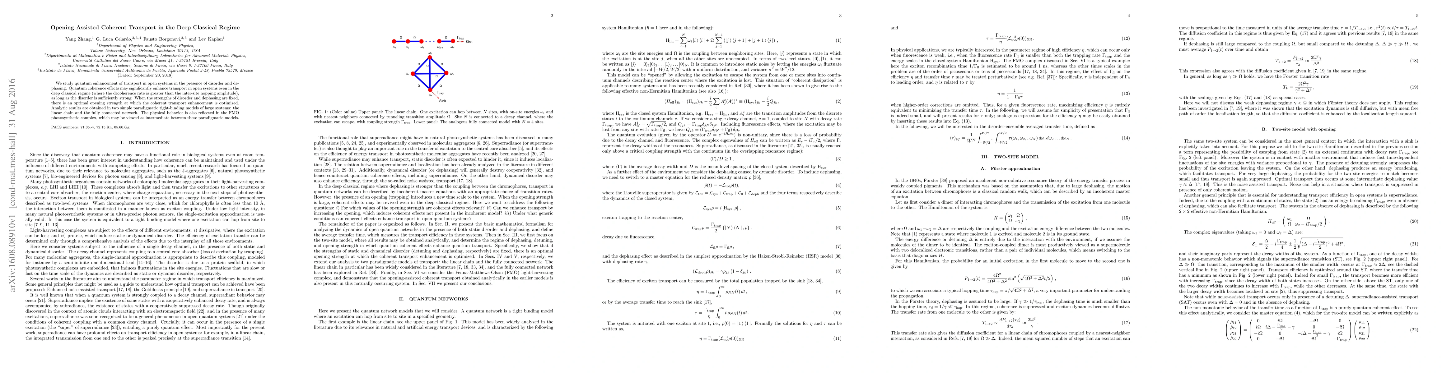 We study quantum enhancement of transport in open systems in the presence of disorder and dephasing. Quantum coherence effects may significantly enhance transport in open systems even in the deep classical regime (where the decoherence rate is greater than the inter-site hopping amplitude), as long as the disorder is sufficiently strong. When the strengths of disorder and dephasing are fixed, there is an optimal opening strength at which the coherent transport enhancement is optimized. Analytic results are obtained in two simple paradigmatic tight-binding models of large systems: the linear chain and the fully connected network. The physical behavior is also reflected in the FMO photosynthetic complex, which may be viewed as intermediate between these paradigmatic models.
