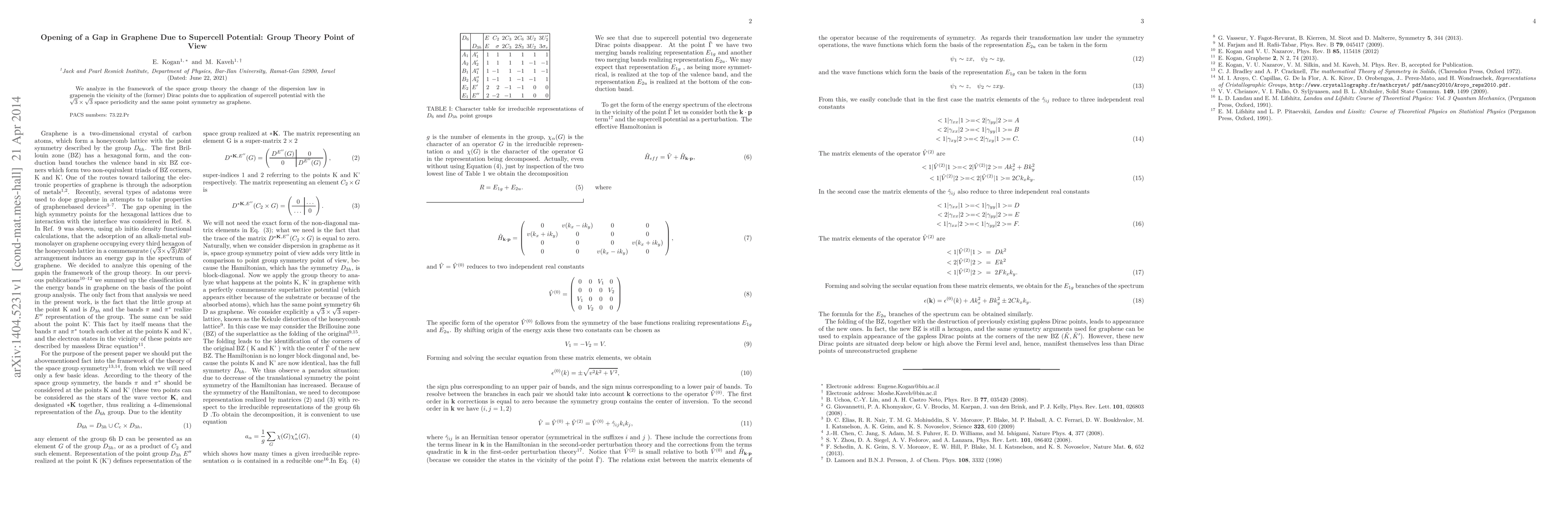 We analyze in the framework of the space group theory the change of the dispersion law in grapenein the vicinity of the (former) Dirac points due to application of supercell potential with the $\sqrt{3}\times\sqrt{3}$ space periodicity and the same point symmetry as graphene.