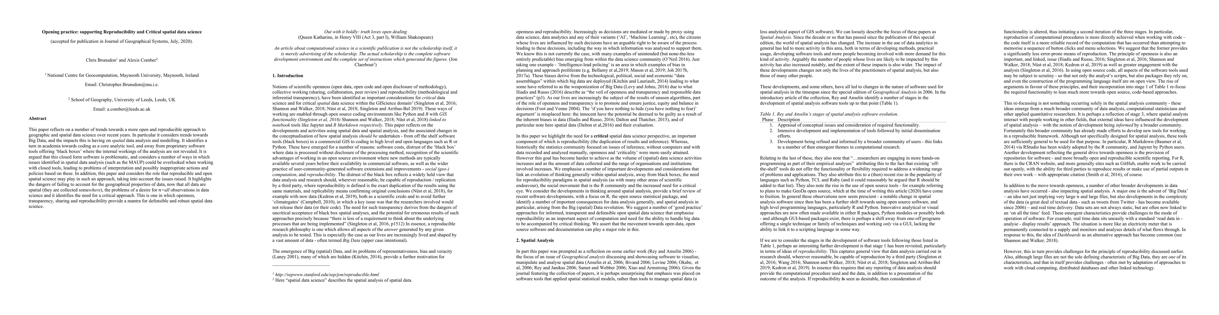 A recent study emphasizes the importance of open and reproducible spatial data science to prevent problems in interpretation and policy-making due to proprietary software tools. It advocates for a critical approach that prioritizes openness, transparency, sharing, and reproducibility in defensible and robust spatial data analysis.