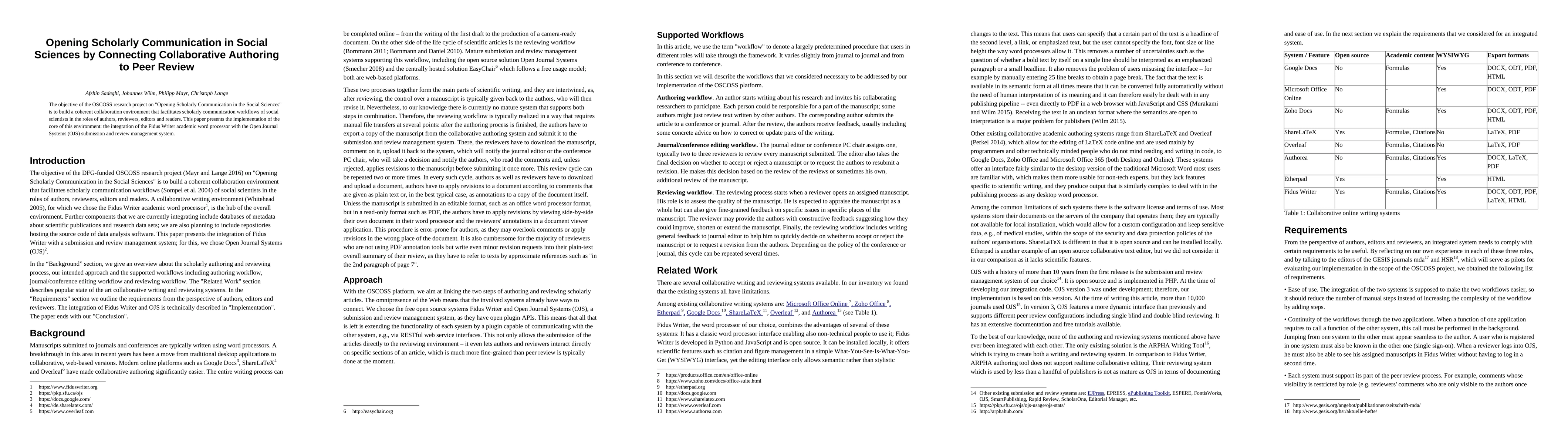 This paper details the OSCOSS project's aim to enhance scholarly communication in social sciences by integrating Fidus Writer with OJS, creating a collaborative environment for authors, reviewers, editors, and readers. The implementation focuses on streamlining workflows through collaborative authoring and peer review integration.