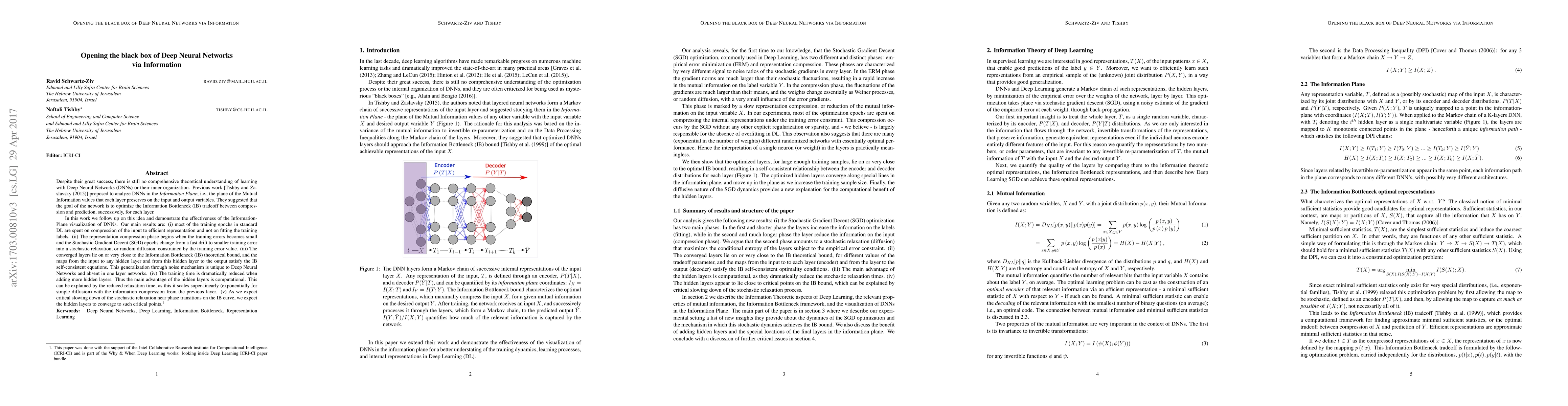 Despite their great success, there is still no comprehensive theoretical understanding of learning with Deep Neural Networks (DNNs) or their inner organization. Previous work proposed to analyze DNNs in the \textit{Information Plane}; i.e., the plane of the Mutual Information values that each layer preserves on the input and output variables. They suggested that the goal of the network is to optimize the Information Bottleneck (IB) tradeoff between compression and prediction, successively, for each layer. In this work we follow up on this idea and demonstrate the effectiveness of the Information-Plane visualization of DNNs. Our main results are: (i) most of the training epochs in standard DL are spent on {\emph compression} of the input to efficient representation and not on fitting the training labels. (ii) The representation compression phase begins when the training errors becomes small and the Stochastic Gradient Decent (SGD) epochs change from a fast drift to smaller training error into a stochastic relaxation, or random diffusion, constrained by the training error value. (iii) The converged layers lie on or very close to the Information Bottleneck (IB) theoretical bound, and the maps from the input to any hidden layer and from this hidden layer to the output satisfy the IB self-consistent equations. This generalization through noise mechanism is unique to Deep Neural Networks and absent in one layer networks. (iv) The training time is dramatically reduced when adding more hidden layers. Thus the main advantage of the hidden layers is computational. This can be explained by the reduced relaxation time, as this it scales super-linearly (exponentially for simple diffusion) with the information compression from the previous layer.