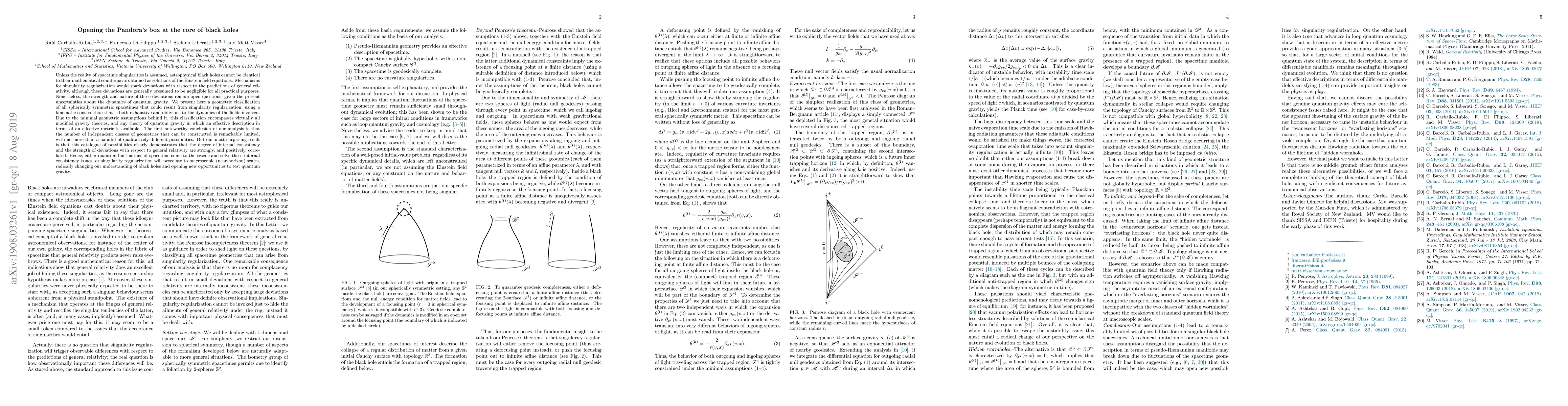 Unless the reality of spacetime singularities is assumed, astrophysical black holes cannot be identical to their mathematical counterparts obtained as solutions of the Einstein field equations. Mechanisms for singularity regularization would spark deviations with respect to the predictions of general relativity, although these deviations are generally presumed to be negligible for all practical purposes. Nonetheless, the strength and nature of these deviations remain open questions, given the present uncertainties about the dynamics of quantum gravity. We present here a geometric classification of all spherically symmetric spacetimes that could result from singularity regularization, using a kinematic construction that is both exhaustive and oblivious to the dynamics of the fields involved. Due to the minimal geometric assumptions behind it, this classification encompasses virtually all modified gravity theories, and any theory of quantum gravity in which an effective description in terms of an effective metric is available. The first noteworthy conclusion of our analysis is that the number of independent classes of geometries that can be constructed is remarkably limited, with no more than a handful of qualitatively different possibilities. But our most surprising result is that this catalogue of possibilities clearly demonstrates that the degree of internal consistency and the strength of deviations with respect to general relativity are strongly, and positively, correlated. Hence, either quantum fluctuations of spacetime come to the rescue and solve these internal consistency issues, or singularity regularization will percolate to macroscopic (near-horizon) scales, radically changing our understanding of black holes and opening new opportunities to test quantum gravity.