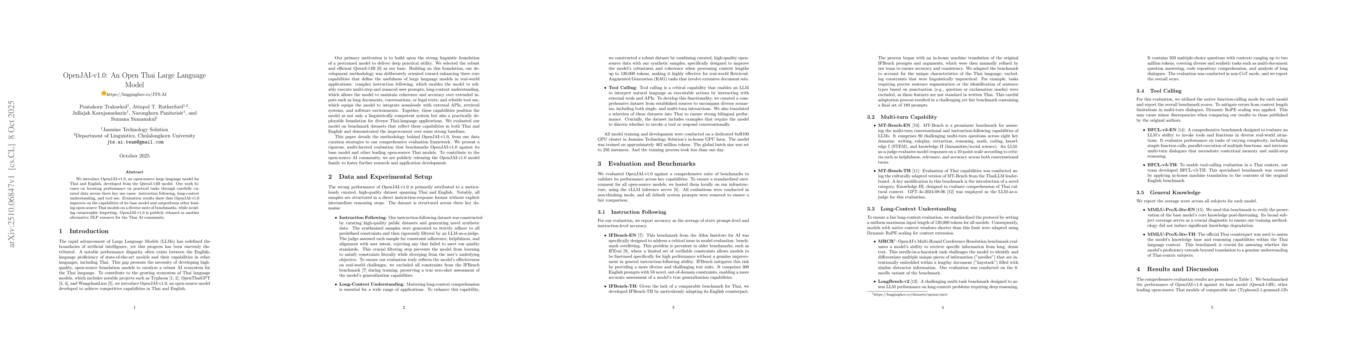 The work presents a bilingual Thai-English model specifically optimized for practical tasks, with a focus on robustness and coherence for extended context processing, and includes culturally adapted benchmarks for Thai evaluation.
