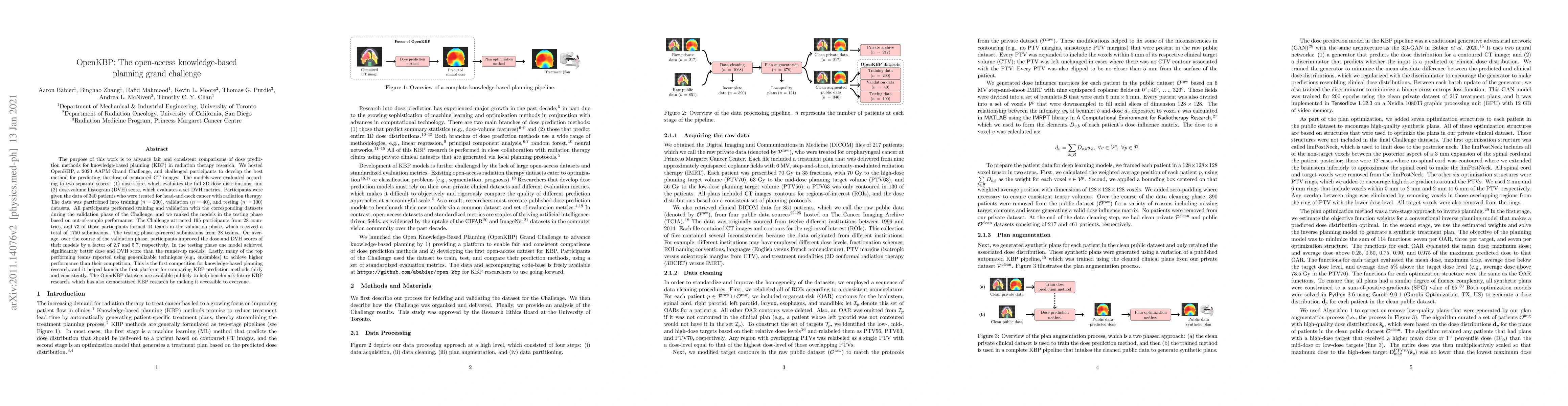 The purpose of this work is to advance fair and consistent comparisons of dose prediction methods for knowledge-based planning (KBP) in radiation therapy research. We hosted OpenKBP, a 2020 AAPM Grand Challenge, and challenged participants to develop the best method for predicting the dose of contoured CT images. The models were evaluated according to two separate scores: (1) dose score, which evaluates the full 3D dose distributions, and (2) dose-volume histogram (DVH) score, which evaluates a set DVH metrics. Participants were given the data of 340 patients who were treated for head-and-neck cancer with radiation therapy. The data was partitioned into training (n=200), validation (n=40), and testing (n=100) datasets. All participants performed training and validation with the corresponding datasets during the validation phase of the Challenge, and we ranked the models in the testing phase based on out-of-sample performance. The Challenge attracted 195 participants from 28 countries, and 73 of those participants formed 44 teams in the validation phase, which received a total of 1750 submissions. The testing phase garnered submissions from 28 teams. On average, over the course of the validation phase, participants improved the dose and DVH scores of their models by a factor of 2.7 and 5.7, respectively. In the testing phase one model achieved significantly better dose and DVH score than the runner-up models. Lastly, many of the top performing teams reported using generalizable techniques (e.g., ensembles) to achieve higher performance than their competition. This is the first competition for knowledge-based planning research, and it helped launch the first platform for comparing KBP prediction methods fairly and consistently. The OpenKBP datasets are available publicly to help benchmark future KBP research, which has also democratized KBP research by making it accessible to everyone.