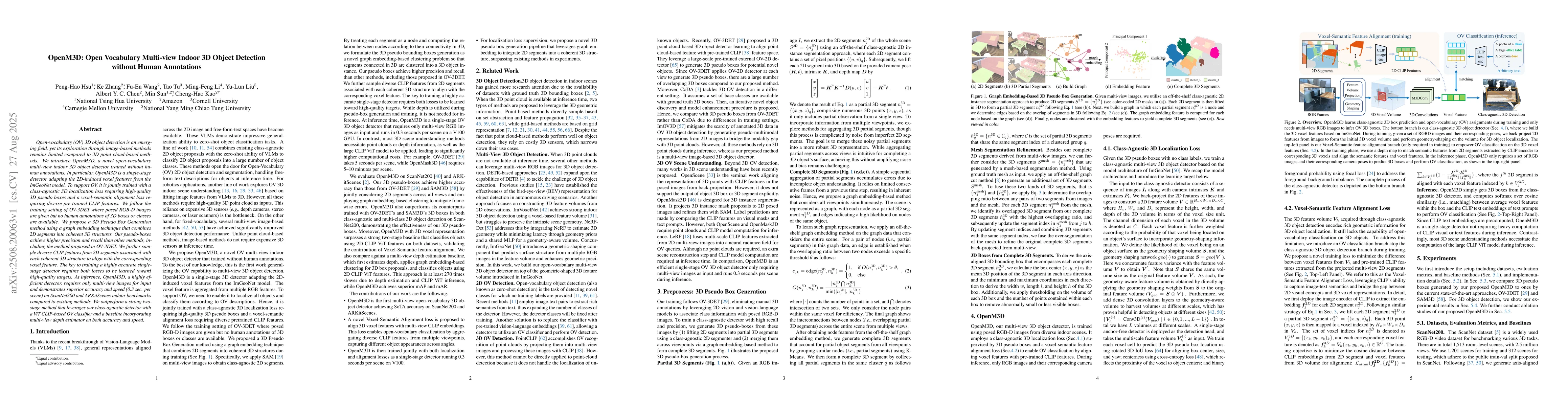 Open-vocabulary (OV) 3D object detection is an emerging field, yet its exploration through image-based methods remains limited compared to 3D point cloud-based methods. We introduce OpenM3D, a novel open-vocabulary multi-view indoor 3D object detector trained without human annotations. In particular, OpenM3D is a single-stage detector adapting the 2D-induced voxel features from the ImGeoNet model. To support OV, it is jointly trained with a class-agnostic 3D localization loss requiring high-quality 3D pseudo boxes and a voxel-semantic alignment loss requiring diverse pre-trained CLIP features. We follow the training setting of OV-3DET where posed RGB-D images are given but no human annotations of 3D boxes or classes are available. We propose a 3D Pseudo Box Generation method using a graph embedding technique that combines 2D segments into coherent 3D structures. Our pseudo-boxes achieve higher precision and recall than other methods, including the method proposed in OV-3DET. We further sample diverse CLIP features from 2D segments associated with each coherent 3D structure to align with the corresponding voxel feature. The key to training a highly accurate single-stage detector requires both losses to be learned toward high-quality targets. At inference, OpenM3D, a highly efficient detector, requires only multi-view images for input and demonstrates superior accuracy and speed (0.3 sec. per scene) on ScanNet200 and ARKitScenes indoor benchmarks compared to existing methods. We outperform a strong two-stage method that leverages our class-agnostic detector with a ViT CLIP-based OV classifier and a baseline incorporating multi-view depth estimator on both accuracy and speed.