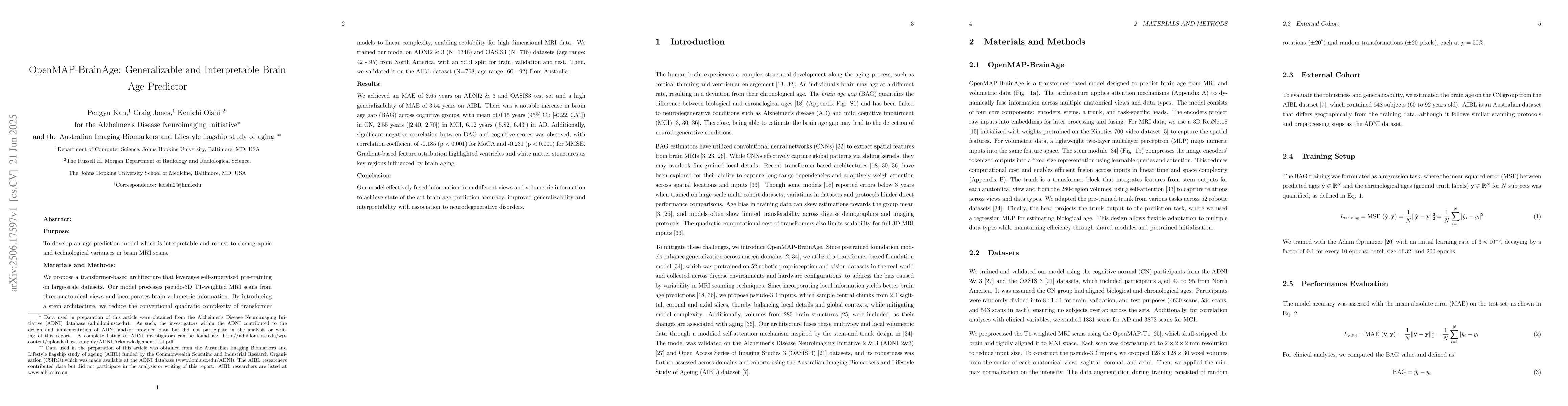 Purpose: To develop an age prediction model which is interpretable and robust to demographic and technological variances in brain MRI scans. Materials and Methods: We propose a transformer-based architecture that leverages self-supervised pre-training on large-scale datasets. Our model processes pseudo-3D T1-weighted MRI scans from three anatomical views and incorporates brain volumetric information. By introducing a stem architecture, we reduce the conventional quadratic complexity of transformer models to linear complexity, enabling scalability for high-dimensional MRI data. We trained our model on ADNI2 $\&$ 3 (N=1348) and OASIS3 (N=716) datasets (age range: 42 - 95) from the North America, with an 8:1:1 split for train, validation and test. Then, we validated it on the AIBL dataset (N=768, age range: 60 - 92) from Australia. Results: We achieved an MAE of 3.65 years on ADNI2 $\&$ 3 and OASIS3 test set and a high generalizability of MAE of 3.54 years on AIBL. There was a notable increase in brain age gap (BAG) across cognitive groups, with mean of 0.15 years (95% CI: [-0.22, 0.51]) in CN, 2.55 years ([2.40, 2.70]) in MCI, 6.12 years ([5.82, 6.43]) in AD. Additionally, significant negative correlation between BAG and cognitive scores was observed, with correlation coefficient of -0.185 (p < 0.001) for MoCA and -0.231 (p < 0.001) for MMSE. Gradient-based feature attribution highlighted ventricles and white matter structures as key regions influenced by brain aging. Conclusion: Our model effectively fused information from different views and volumetric information to achieve state-of-the-art brain age prediction accuracy, improved generalizability and interpretability with association to neurodegenerative disorders.