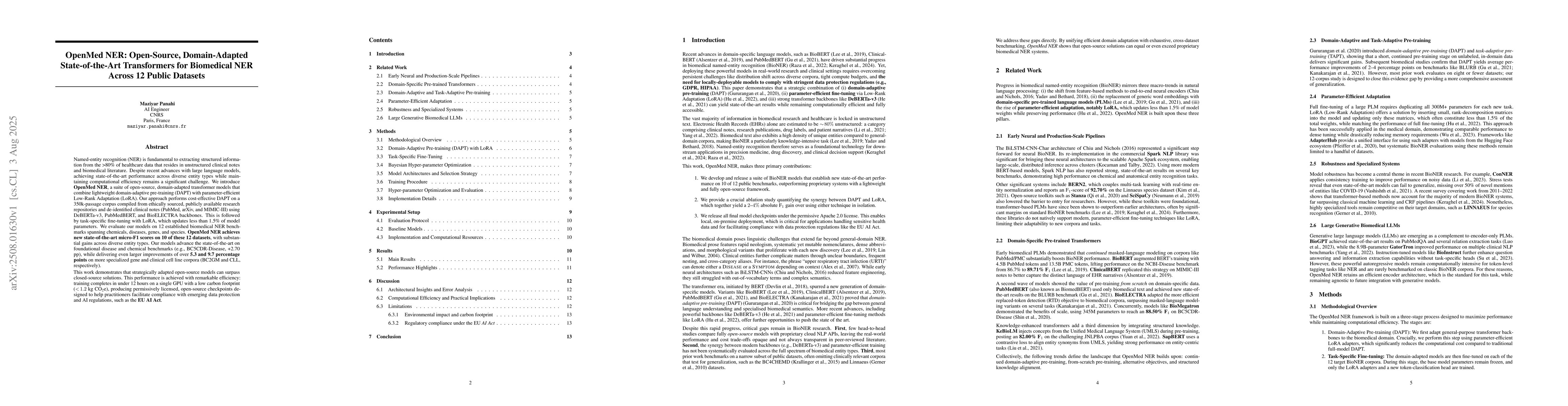 Named-entity recognition (NER) is fundamental to extracting structured information from the >80% of healthcare data that resides in unstructured clinical notes and biomedical literature. Despite recent advances with large language models, achieving state-of-the-art performance across diverse entity types while maintaining computational efficiency remains a significant challenge. We introduce OpenMed NER, a suite of open-source, domain-adapted transformer models that combine lightweight domain-adaptive pre-training (DAPT) with parameter-efficient Low-Rank Adaptation (LoRA). Our approach performs cost-effective DAPT on a 350k-passage corpus compiled from ethically sourced, publicly available research repositories and de-identified clinical notes (PubMed, arXiv, and MIMIC-III) using DeBERTa-v3, PubMedBERT, and BioELECTRA backbones. This is followed by task-specific fine-tuning with LoRA, which updates less than 1.5% of model parameters. We evaluate our models on 12 established biomedical NER benchmarks spanning chemicals, diseases, genes, and species. OpenMed NER achieves new state-of-the-art micro-F1 scores on 10 of these 12 datasets, with substantial gains across diverse entity types. Our models advance the state-of-the-art on foundational disease and chemical benchmarks (e.g., BC5CDR-Disease, +2.70 pp), while delivering even larger improvements of over 5.3 and 9.7 percentage points on more specialized gene and clinical cell line corpora. This work demonstrates that strategically adapted open-source models can surpass closed-source solutions. This performance is achieved with remarkable efficiency: training completes in under 12 hours on a single GPU with a low carbon footprint (< 1.2 kg CO2e), producing permissively licensed, open-source checkpoints designed to help practitioners facilitate compliance with emerging data protection and AI regulations, such as the EU AI Act.