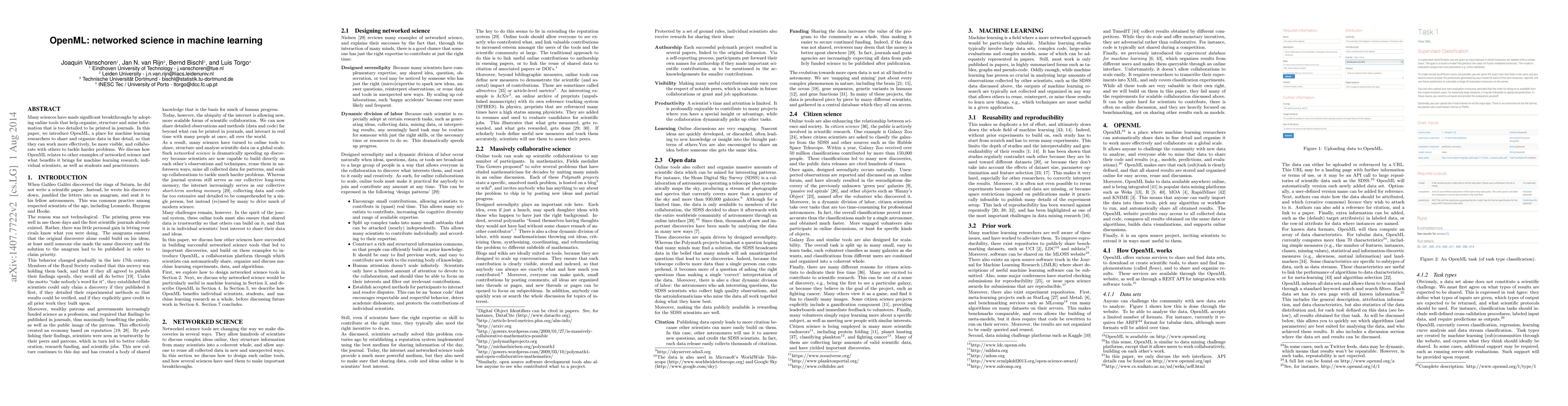 OpenML is a platform for machine learning researchers to share and organize data in detail, enhancing collaboration and visibility. It fosters networked science in machine learning, benefiting researchers, students, and practitioners.