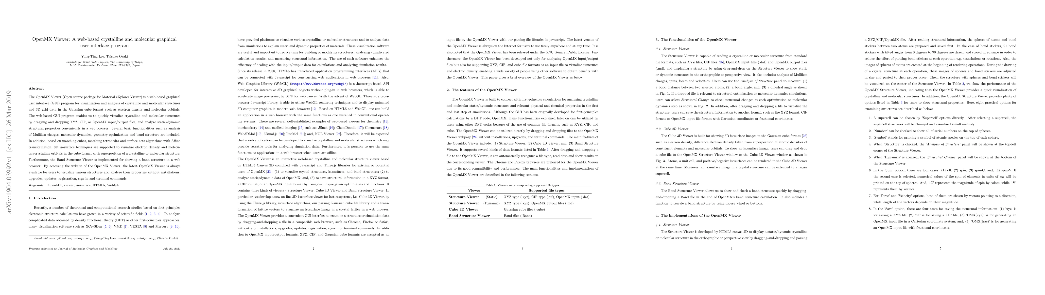 The OpenMX Viewer is a web-based GUI for visualizing and analyzing crystalline and molecular structures, offering functionalities like Mulliken charge analysis, molecular dynamics, and band structure visualization without requiring installations or sign-ins. It supports 3D isosurface techniques and is accessible via any web browser.