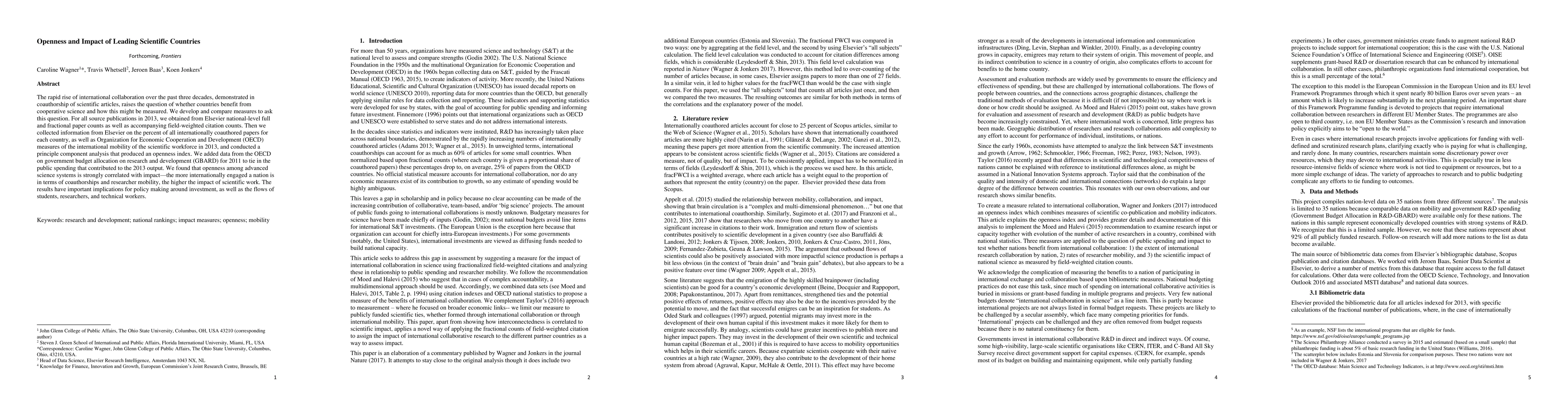 The rapid rise of international collaboration over the past three decades, demonstrated in coauthorship of scientific articles, raises the question of whether countries benefit from cooperative science and how this might be measured. We develop and compare measures to ask this question. For all source publications in 2013, we obtained from Elsevier national level full and fractional paper counts as well as accompanying field-weighted citation counts. Then we collected information from Elsevier on the percent of all internationally coauthored papers for each country, as well as Organization for Economic Cooperation and Development measures of the international mobility of the scientific workforce in 2013, and conducted a principle component analysis that produced an openness index. We added data from the OECD on government budget allocation on research and development for 2011 to tie in the public spending that contributed to the 2013 output. We found that openness among advanced science systems is strongly correlated with impact: the more internationally engaged a nation is in terms of coauthorships and researcher mobility, the higher the impact of scientific work. The results have important implications for policy making around investment, as well as the flows of students, researchers, and technical workers.