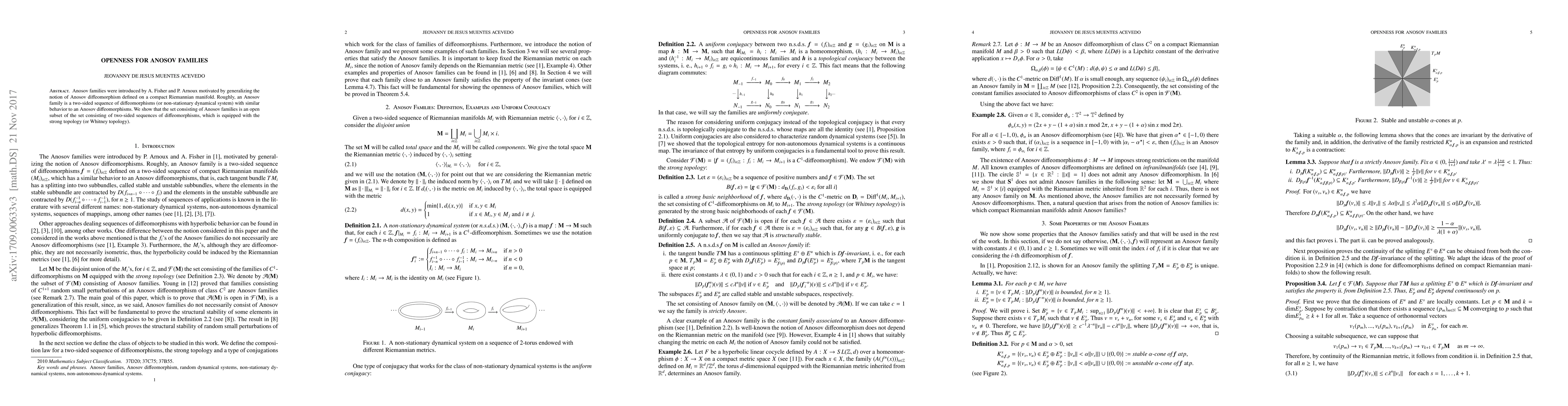 Anosov families were introduced by A. Fisher and P. Arnoux motivated by generalizing the notion of Anosov diffeomorphism defined on a compact Riemannian manifold. Roughly, an Anosov family is a two-sided sequence of diffeomorphisms (or non-stationary dynamical system) with similar behavior to an Anosov diffeomorphisms. We show that the set consisting of Anosov families is an open subset of the set consisting of two-sided sequences of diffeomorphisms, which is endowed with the strong topology (or Whitney topology).