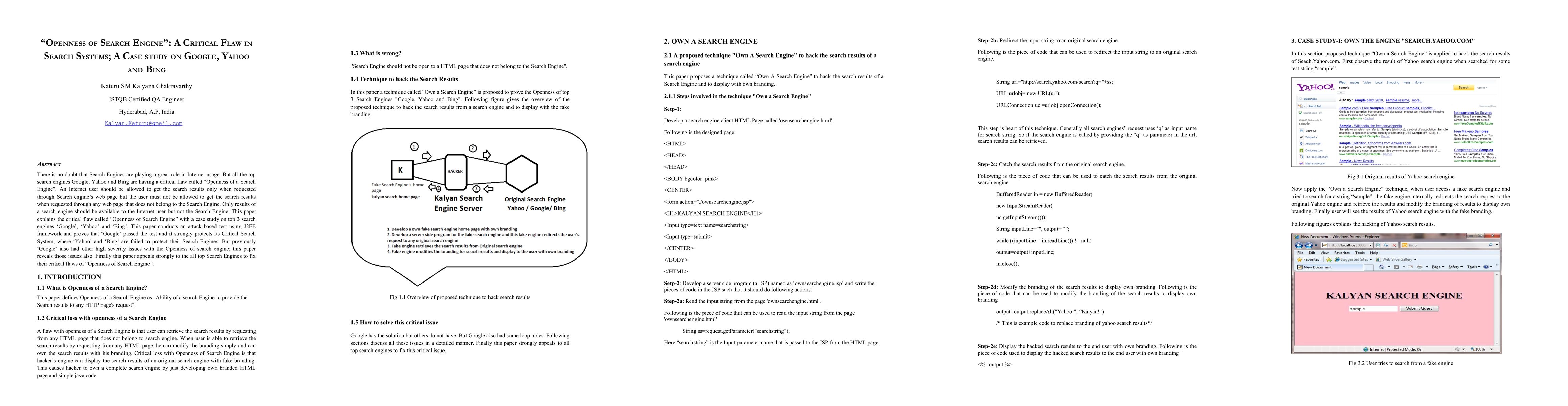 There is no doubt that Search Engines are playing a great role in Internet usage. But all the top search engines Google, Yahoo and Bing are having a critical flaw called "Openness of a Search Engine". An Internet user should be allowed to get the search results only when requested through Search engine's web page but the user must not be allowed to get the search results when requested through any web page that does not belong to the Search Engine. Only results of a search engine should be available to the Internet user but not the Search Engine. This paper explains the critical flaw called "Openness of Search Engine" with a case study on top 3 search engines 'Google', 'Yahoo' and 'Bing'. This paper conducts an attack based test using J2EE framework and proves that 'Google' passed the test and it strongly protects its Critical Search System, where 'Yahoo' and 'Bing' are failed to protect their Search Engines. But previously 'Google' also had other high severity issues with the Openness of search engine; this paper reveals those issues also. Finally this paper appeals strongly to the all top Search Engines to fix their critical flaws of "Openness of Search Engine".