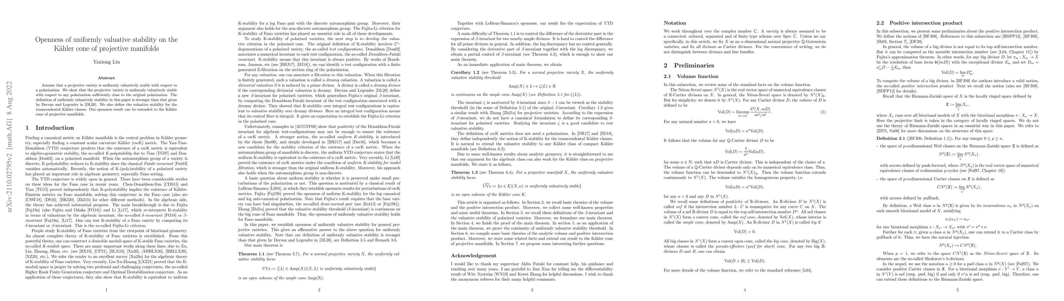 The paper demonstrates that if a projective variety is uniformly valuatively stable concerning a given polarization, it remains so for any nearby polarization. The concept of uniformly valuative stability here is stricter than prior definitions, and the findings are extendable to the Kähler cone of projective manifolds.