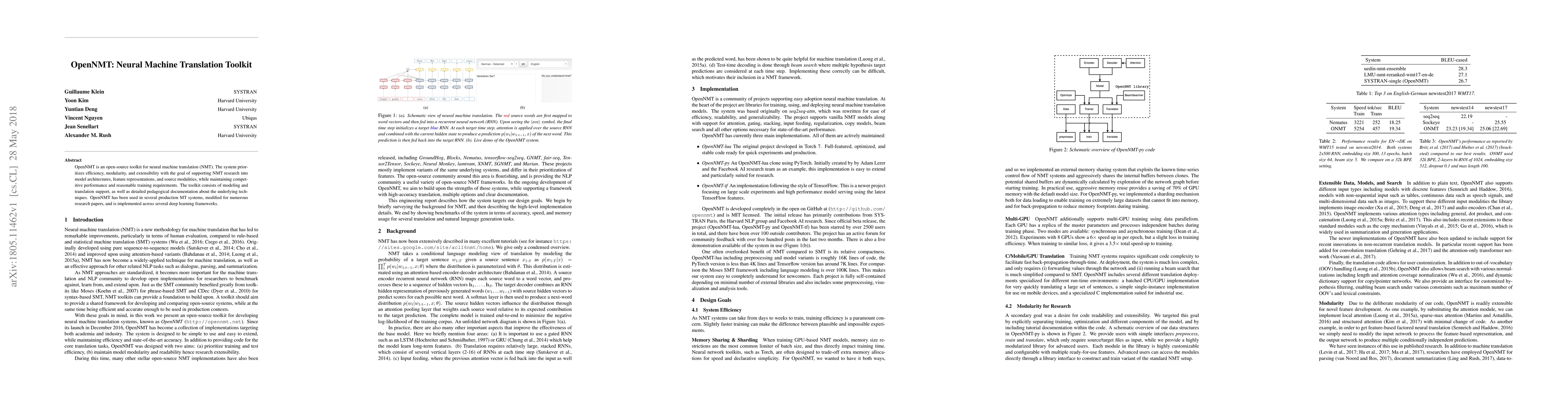 OpenNMT is an open-source toolkit designed for neural machine translation, emphasizing efficiency and modularity to facilitate NMT research while maintaining competitive translation performance. It offers extensive documentation and supports multiple deep learning frameworks.
