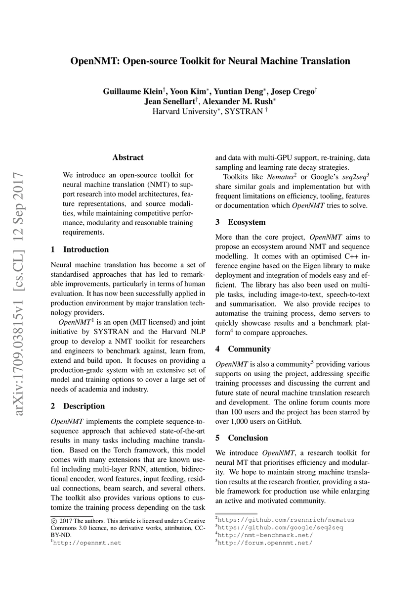 Summary: OpenNMT is an open-source toolkit designed for neural machine translation, aiming to facilitate research on model architectures and feature representations while ensuring competitive performance, modularity, and manageable training requirements.