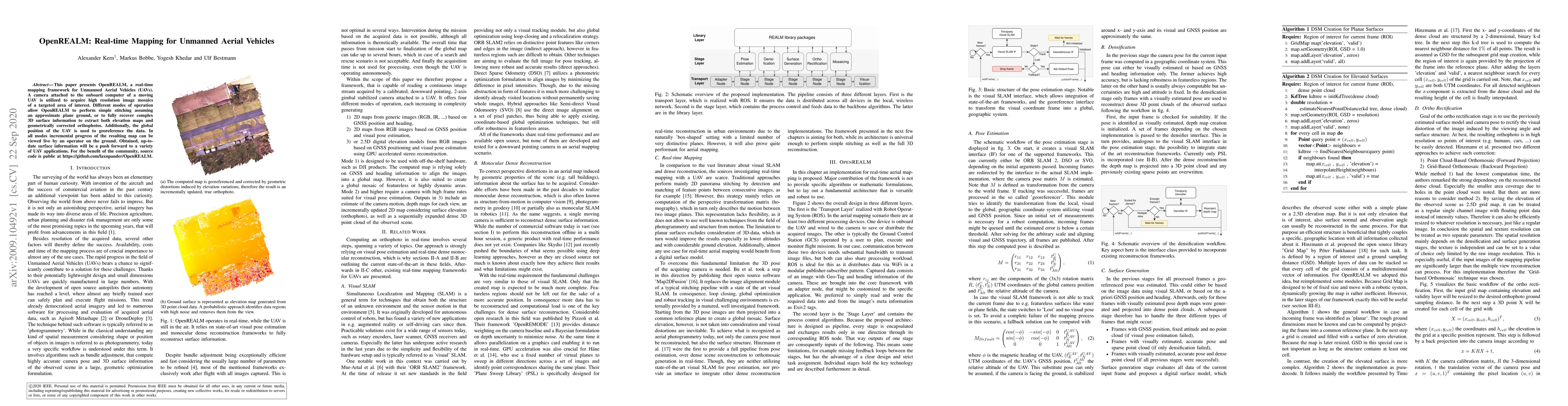 OpenREALM is a real-time mapping framework for UAVs that uses onboard cameras to create high-resolution image mosaics, offering both simple stitching and complex 3D surface recovery for elevation maps and orthophotos, all georeferenced and viewable in real-time. Source code is publicly available for community benefit.
