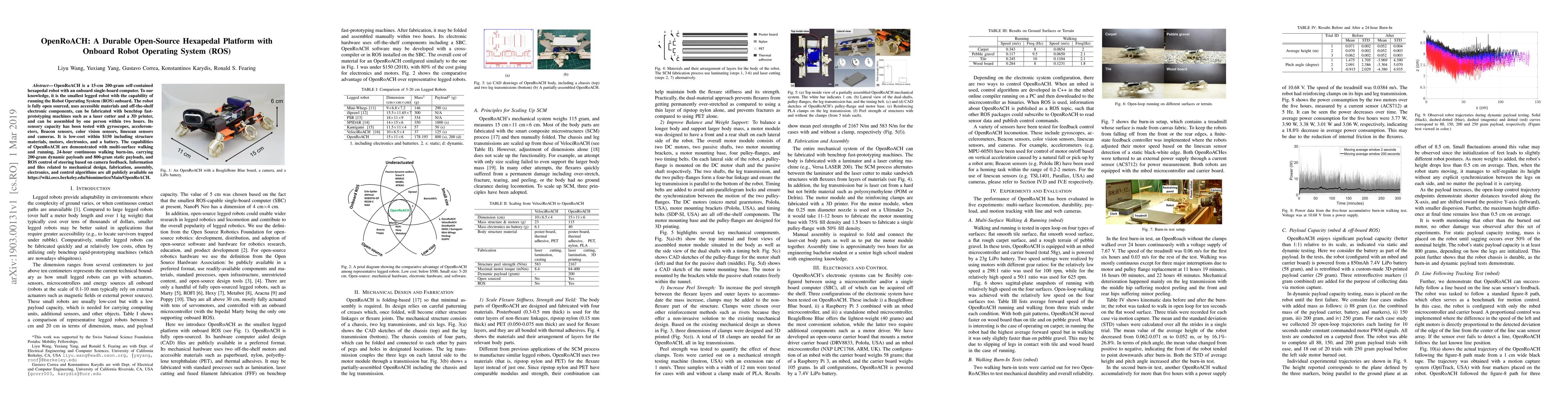 OpenRoACH is a compact, open-source hexapedal robot capable of running ROS, fabricated from accessible materials and demonstrated with multi-surface locomotion and payload carrying. Its design and components are publicly available for community use.