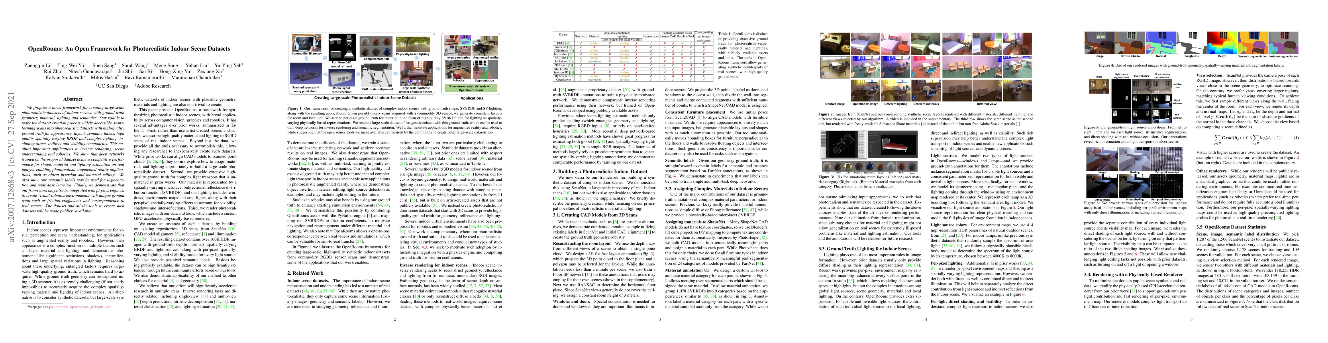 We propose a novel framework for creating large-scale photorealistic datasets of indoor scenes, with ground truth geometry, material, lighting and semantics. Our goal is to make the dataset creation process widely accessible, transforming scans into photorealistic datasets with high-quality ground truth for appearance, layout, semantic labels, high quality spatially-varying BRDF and complex lighting, including direct, indirect and visibility components. This enables important applications in inverse rendering, scene understanding and robotics. We show that deep networks trained on the proposed dataset achieve competitive performance for shape, material and lighting estimation on real images, enabling photorealistic augmented reality applications, such as object insertion and material editing. We also show our semantic labels may be used for segmentation and multi-task learning. Finally, we demonstrate that our framework may also be integrated with physics engines, to create virtual robotics environments with unique ground truth such as friction coefficients and correspondence to real scenes. The dataset and all the tools to create such datasets will be made publicly available.