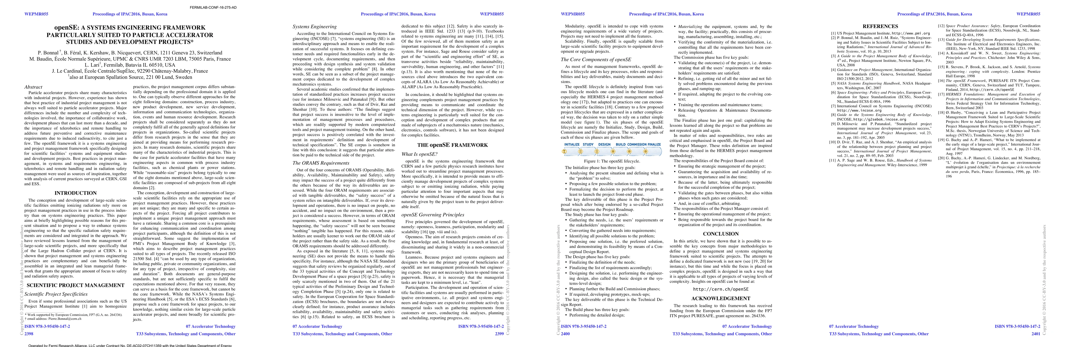 The openSE framework is a specialized systems engineering and project management approach tailored for particle accelerator studies and development projects, addressing unique challenges such as long development phases, complex technology integration, and the need for remote handling and radiation safety. It draws on best practices from industrial project management, systems engineering, and telerobotics.