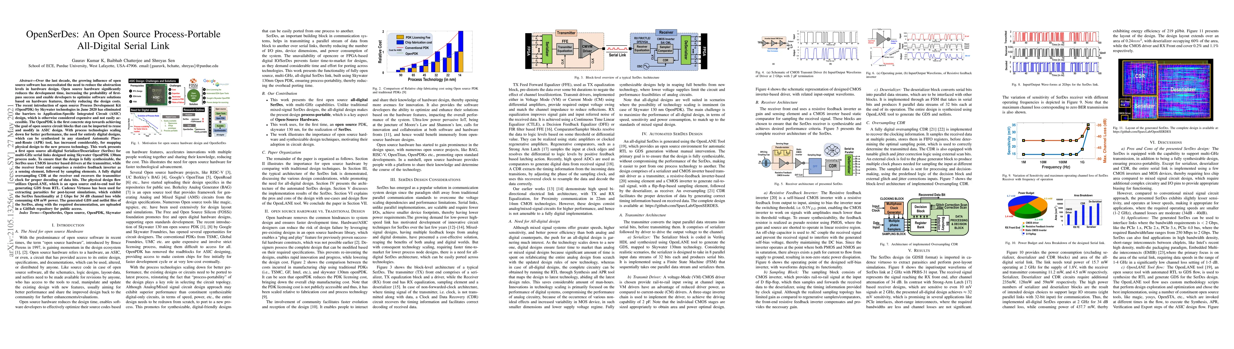 In the last decade, the growing influence of open source software has necessitated the need to reduce the abstraction levels in hardware design. Open source hardware significantly reduces the development time, increasing the probability of first-pass success and enable developers to optimize software solutions based on hardware features, thereby reducing the design costs. The recent introduction of open source Process Development Kit (OpenPDK) by Skywater technologies in June 2020 has eliminated the barriers to Application-Specific Integrated Circuit (ASIC) design, which is otherwise considered expensive and not easily accessible. The OpenPDK is the first concrete step towards achieving the goal of open source circuit blocks that can be imported to reuse and modify in ASIC design. With process technologies scaling down for better performance, the need for entirely digital designs, which can be synthesized in any standard Automatic Place-and-Route (APR) tool, has increased considerably, for mapping physical design to the new process technology. This work presents the first open source all-digital Serializer/Deserializer (SerDes) for multi-GHz serial links designed using Skywater OpenPDK 130nm process node. To ensure that the design is fully synthesizable, the SerDes uses CMOS inverter-based drivers at the Tx, while the Rx front end comprises a resistive feedback inverter as a sensing element, followed by sampling elements. A fully digital oversampling CDR at the Rx recovers the Tx clock for proper decoding of data bits. The physical design flow utilizes OpenLANE, which is an end-to-end tool for generating GDS from RTL. Virtuoso has been used for extracting parasitics for post-layout simulations, which exhibit the SerDes functionality at 2 Gbps for 34 dB channel loss while consuming 438 mW power. The GDS and netlist files of the SerDes are uploaded in a GitHub repository for public access.