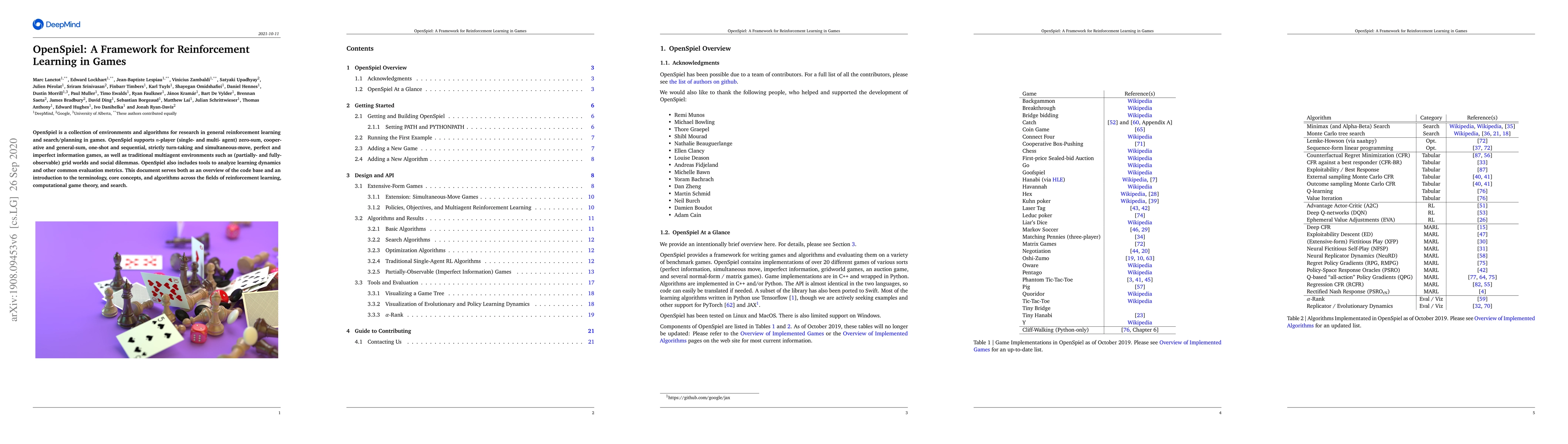 OpenSpiel is a collection of environments and algorithms for research in general reinforcement learning and search/planning in games. OpenSpiel supports n-player (single- and multi- agent) zero-sum, cooperative and general-sum, one-shot and sequential, strictly turn-taking and simultaneous-move, perfect and imperfect information games, as well as traditional multiagent environments such as (partially- and fully- observable) grid worlds and social dilemmas. OpenSpiel also includes tools to analyze learning dynamics and other common evaluation metrics. This document serves both as an overview of the code base and an introduction to the terminology, core concepts, and algorithms across the fields of reinforcement learning, computational game theory, and search.