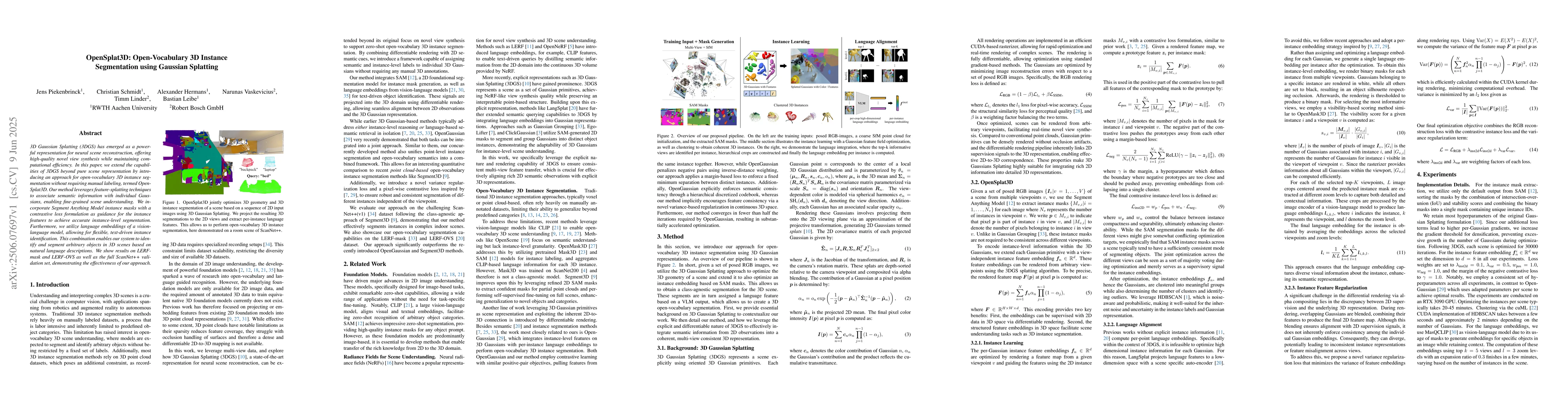 This research is significant as it extends 3D Gaussian Splatting for open-vocabulary 3D instance segmentation, providing a method that combines 2D visual features with 3D representations. It has potential impact in autonomous systems, robotics, and augmented reality, where understanding and segmenting objects in 3D environments is crucial.