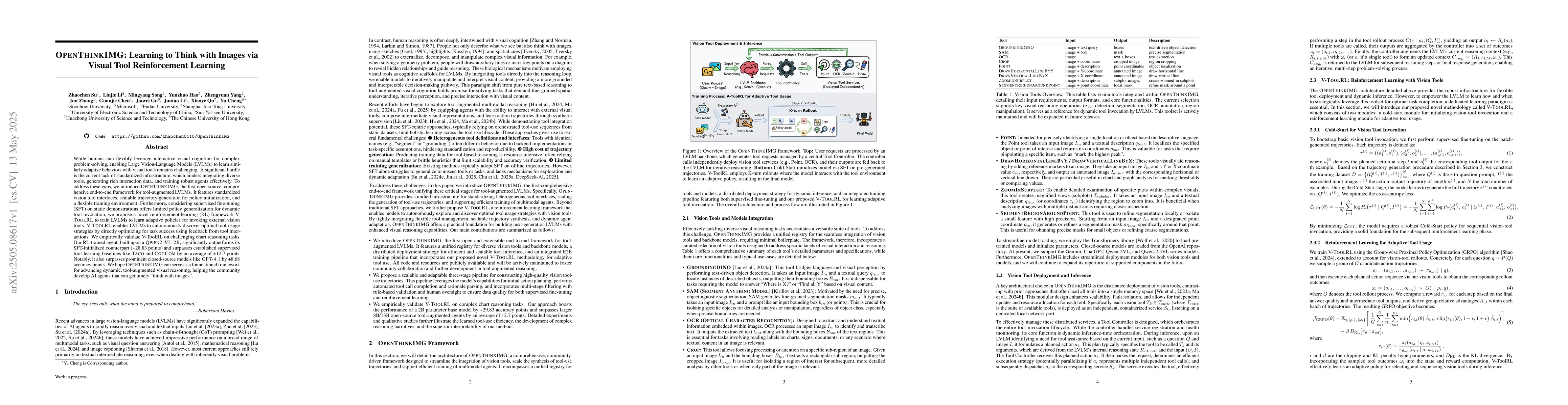 OpenThinkIMG is the first open-source, comprehensive framework for tool-augmented LVLMs, addressing the lack of standardized infrastructure for integrating diverse tools and training robust agents. V-ToolRL introduces a new RL approach for training LVLMs to learn adaptive tool-usage strategies directly from tool interaction feedback.