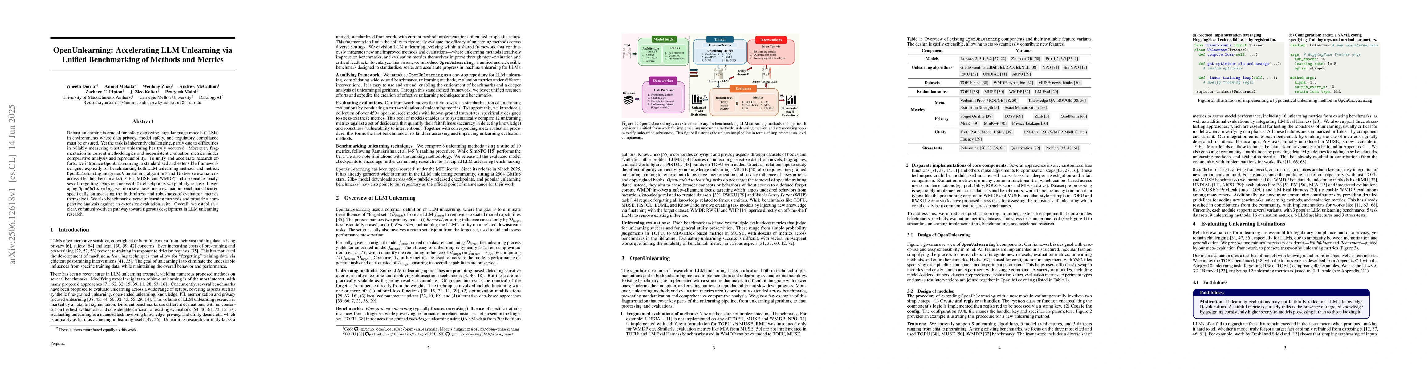 Robust unlearning is crucial for safely deploying large language models (LLMs) in environments where data privacy, model safety, and regulatory compliance must be ensured. Yet the task is inherently challenging, partly due to difficulties in reliably measuring whether unlearning has truly occurred. Moreover, fragmentation in current methodologies and inconsistent evaluation metrics hinder comparative analysis and reproducibility. To unify and accelerate research efforts, we introduce OpenUnlearning, a standardized and extensible framework designed explicitly for benchmarking both LLM unlearning methods and metrics. OpenUnlearning integrates 9 unlearning algorithms and 16 diverse evaluations across 3 leading benchmarks (TOFU, MUSE, and WMDP) and also enables analyses of forgetting behaviors across 450+ checkpoints we publicly release. Leveraging OpenUnlearning, we propose a novel meta-evaluation benchmark focused specifically on assessing the faithfulness and robustness of evaluation metrics themselves. We also benchmark diverse unlearning methods and provide a comparative analysis against an extensive evaluation suite. Overall, we establish a clear, community-driven pathway toward rigorous development in LLM unlearning research.