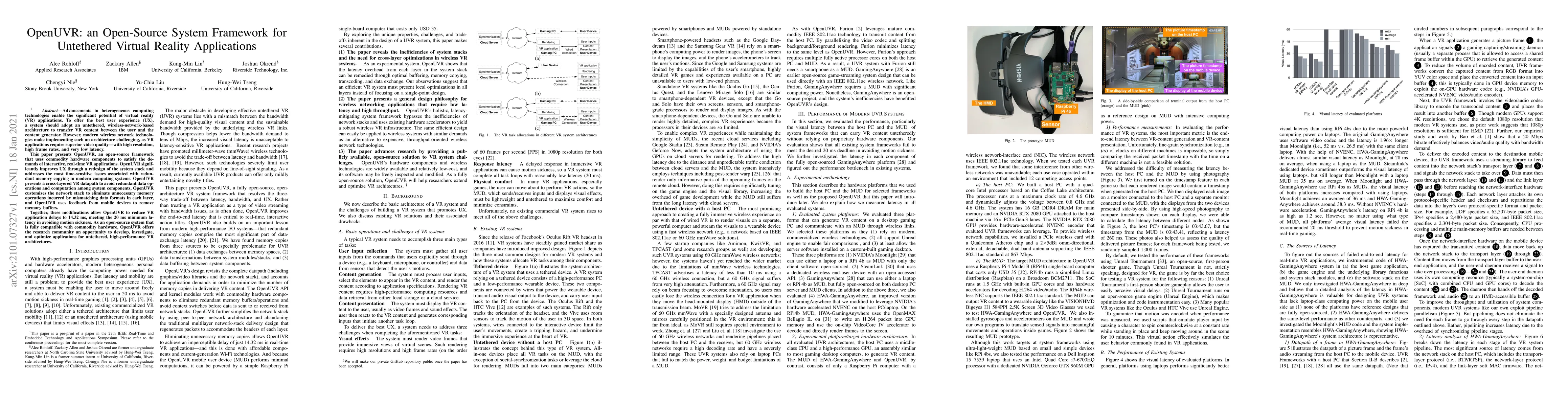 OpenUVR is an open-source framework designed to enhance the user experience of untethered virtual reality applications by utilizing commodity hardware and minimizing latency through optimized system and network stack redesigns. The framework achieves a low delay of 14.32 ms, suitable for high-performance VR, and is fully compatible with existing hardware.