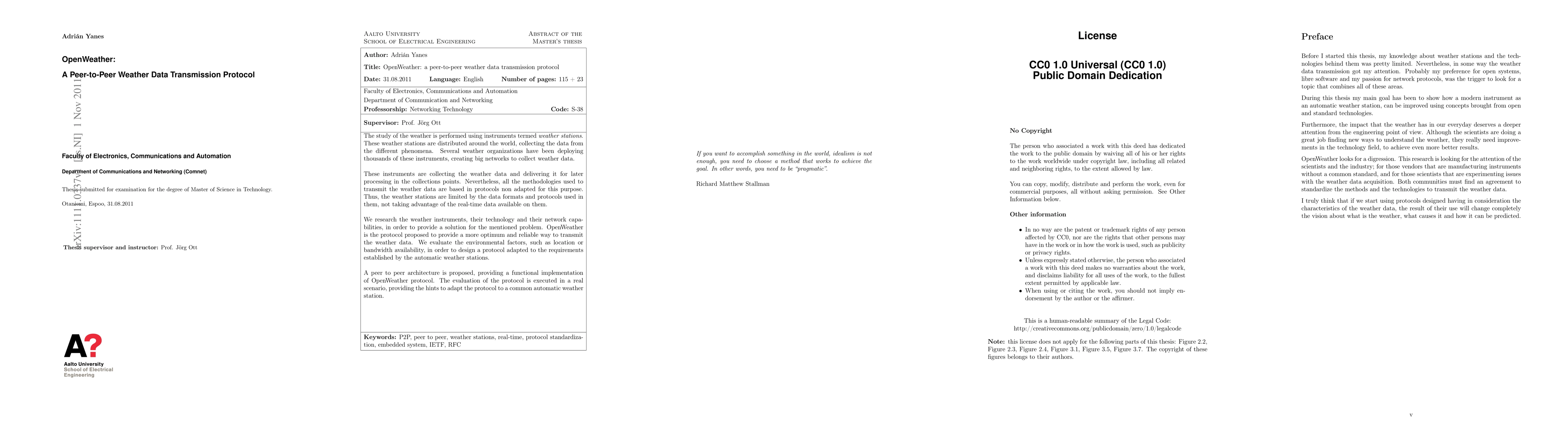 OpenWeather proposes a peer-to-peer protocol for more efficient weather data transmission, addressing limitations of existing methods. The protocol is designed to optimize data transfer based on environmental factors and is evaluated in a real-world scenario.