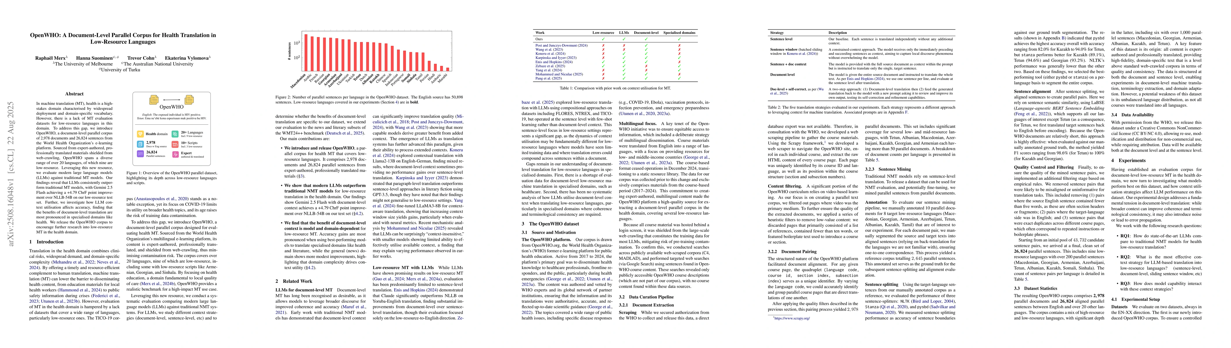 In machine translation (MT), health is a high-stakes domain characterised by widespread deployment and domain-specific vocabulary. However, there is a lack of MT evaluation datasets for low-resource languages in this domain. To address this gap, we introduce OpenWHO, a document-level parallel corpus of 2,978 documents and 26,824 sentences from the World Health Organization's e-learning platform. Sourced from expert-authored, professionally translated materials shielded from web-crawling, OpenWHO spans a diverse range of over 20 languages, of which nine are low-resource. Leveraging this new resource, we evaluate modern large language models (LLMs) against traditional MT models. Our findings reveal that LLMs consistently outperform traditional MT models, with Gemini 2.5 Flash achieving a +4.79 ChrF point improvement over NLLB-54B on our low-resource test set. Further, we investigate how LLM context utilisation affects accuracy, finding that the benefits of document-level translation are most pronounced in specialised domains like health. We release the OpenWHO corpus to encourage further research into low-resource MT in the health domain.