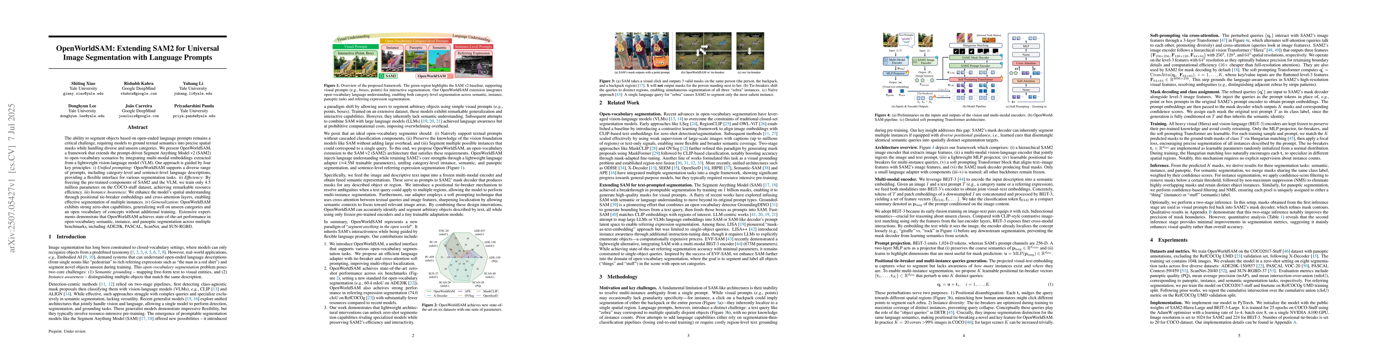 OpenWorldSAM is a framework that extends Segment Anything Model v2 (SAM2) for open-vocabulary image segmentation using language prompts. It integrates a lightweight vision-language model, offering flexibility with diverse prompts, efficiency through parameter-free fine-tuning, enhanced spatial understanding for multiple instances, and strong zero-shot generalization on unseen categories across various benchmarks.