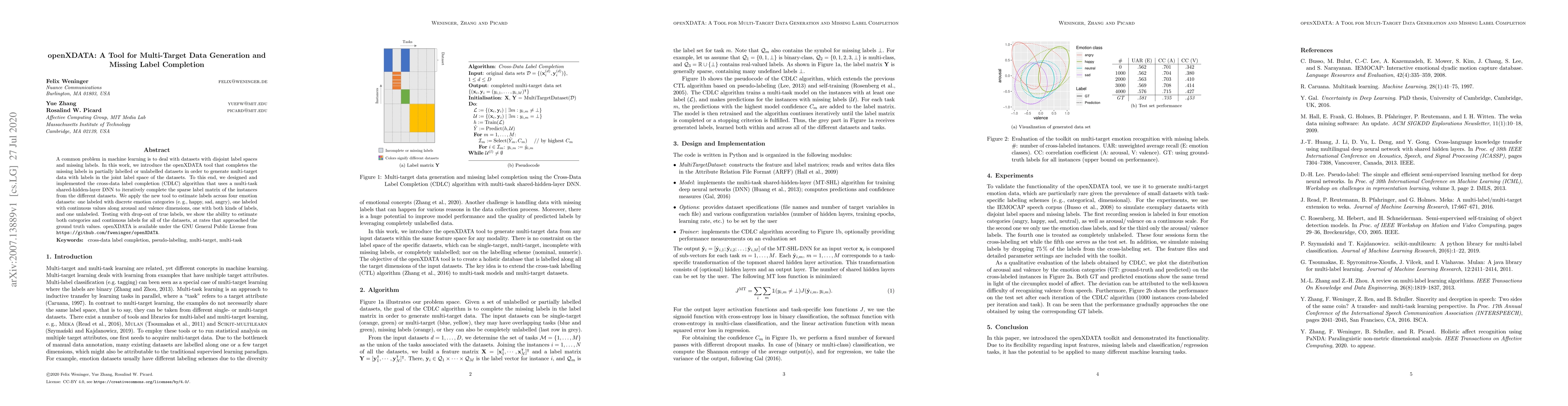 A common problem in machine learning is to deal with datasets with disjoint label spaces and missing labels. In this work, we introduce the openXDATA tool that completes the missing labels in partially labelled or unlabelled datasets in order to generate multi-target data with labels in the joint label space of the datasets. To this end, we designed and implemented the cross-data label completion (CDLC) algorithm that uses a multi-task shared-hidden-layer DNN to iteratively complete the sparse label matrix of the instances from the different datasets. We apply the new tool to estimate labels across four emotion datasets: one labeled with discrete emotion categories (e.g., happy, sad, angry), one labeled with continuous values along arousal and valence dimensions, one with both kinds of labels, and one unlabeled. Testing with drop-out of true labels, we show the ability to estimate both categories and continuous labels for all of the datasets, at rates that approached the ground truth values. openXDATA is available under the GNU General Public License from https://github.com/fweninger/openXDATA.