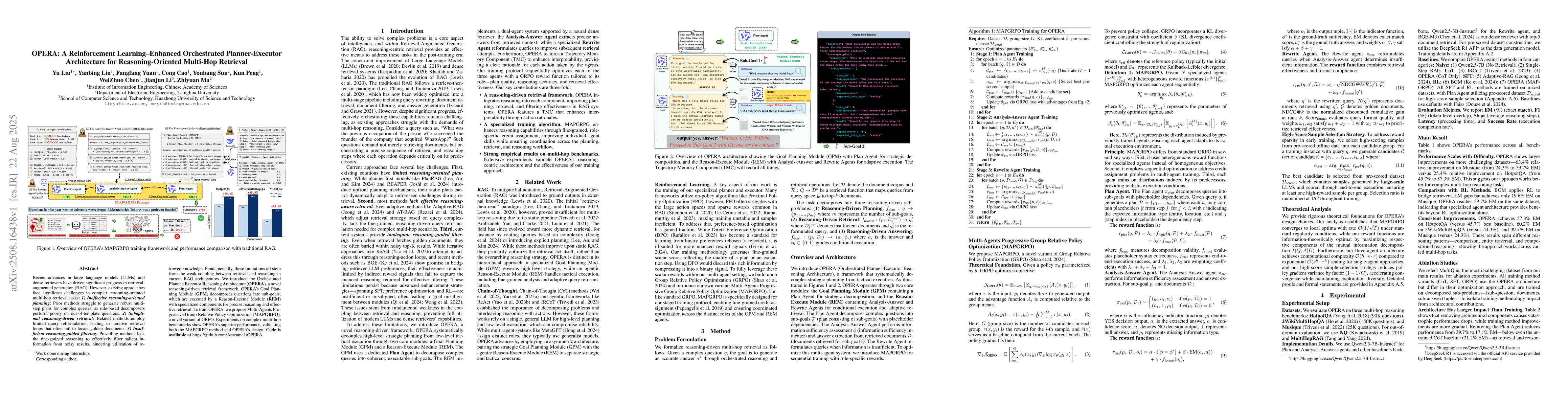 Recent advances in large language models (LLMs) and dense retrievers have driven significant progress in retrieval-augmented generation (RAG). However, existing approaches face significant challenges in complex reasoning-oriented multi-hop retrieval tasks: 1) Ineffective reasoning-oriented planning: Prior methods struggle to generate robust multi-step plans for complex queries, as rule-based decomposers perform poorly on out-of-template questions. 2) Suboptimal reasoning-driven retrieval: Related methods employ limited query reformulation, leading to iterative retrieval loops that often fail to locate golden documents. 3) Insufficient reasoning-guided filtering: Prevailing methods lack the fine-grained reasoning to effectively filter salient information from noisy results, hindering utilization of retrieved knowledge. Fundamentally, these limitations all stem from the weak coupling between retrieval and reasoning in current RAG architectures. We introduce the Orchestrated Planner-Executor Reasoning Architecture (OPERA), a novel reasoning-driven retrieval framework. OPERA's Goal Planning Module (GPM) decomposes questions into sub-goals, which are executed by a Reason-Execute Module (REM) with specialized components for precise reasoning and effective retrieval. To train OPERA, we propose Multi-Agents Progressive Group Relative Policy Optimization (MAPGRPO), a novel variant of GRPO. Experiments on complex multi-hop benchmarks show OPERA's superior performance, validating both the MAPGRPO method and OPERA's design. Code is available at https://github.com/Ameame1/OPERA.