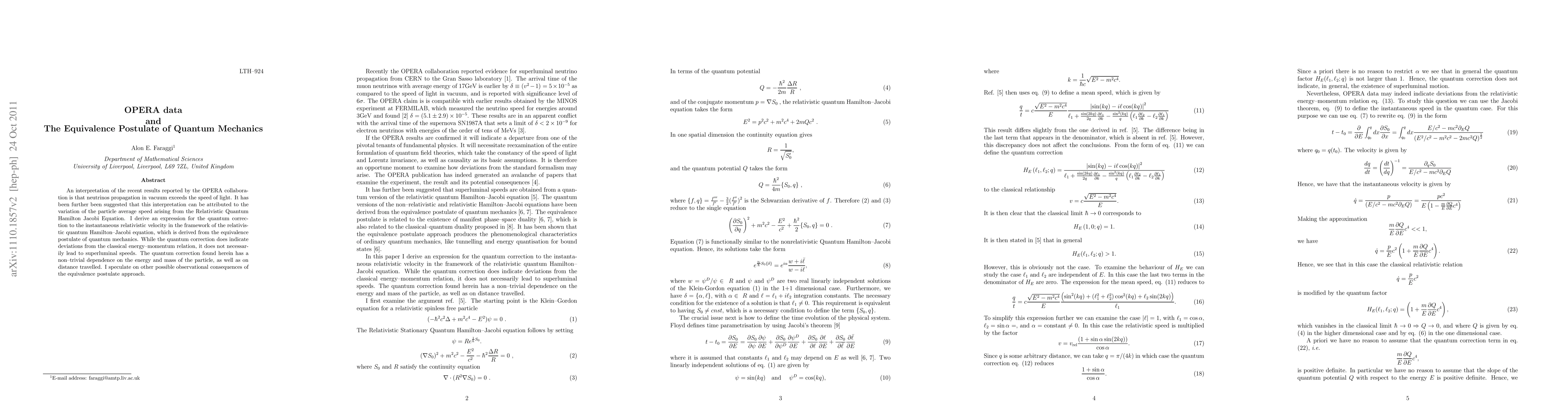 The paper refutes the claim that OPERA's results indicate neutrinos exceeding light speed, showing that the relativistic quantum Hamilton-Jacobi equation does not support superluminal speeds. It derives a quantum correction dependent on particle energy, mass, and distance, suggesting alternative observational consequences of the equivalence postulate.