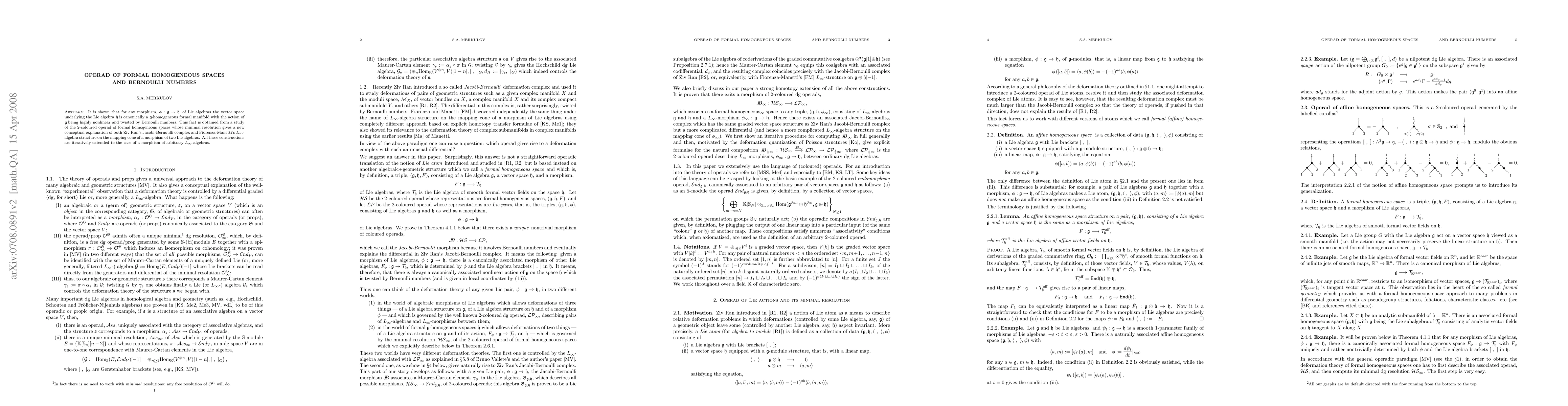 It is shown that for any morphism, i: g --> h, of Lie algebras the vector space underlying the Lie algebra h is canonically a g-homogeneous formal manifold with the action of g being highly nonlinear and twisted by Bernoulli numbers. This fact is obtained from the study of a 2-coloured operad of formal homogeneous spaces and its minimal resolution, and is used to give a new conceptual explanation of both Ziv Ran's Jacobi-Bernoulli complex and Fiorenza-Manetti's L-infinity algebra structure on the mapping cone of a morphism of two Lie algebras. All these constructions are iteratively extended to the case of a morphism of arbitrary L-infinity algebras.