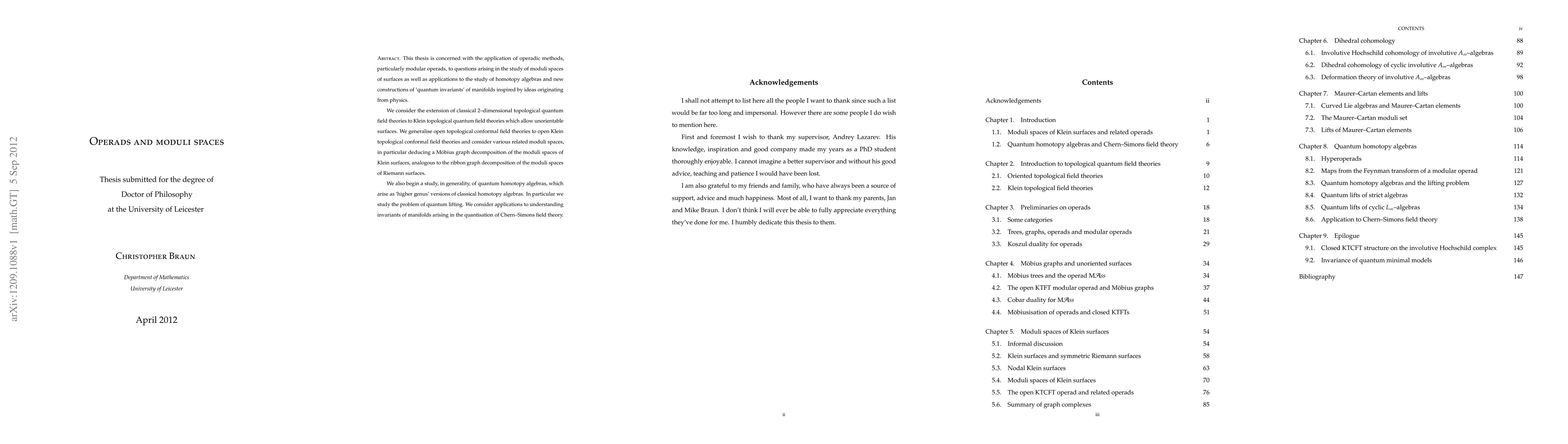 This thesis applies operadic methods, especially modular operads, to explore moduli spaces of surfaces and construct 'quantum invariants' of manifolds, extending classical topological quantum field theories to include unorientable surfaces. It introduces a Mobius graph decomposition for moduli spaces of Klein surfaces, akin to the ribbon graph decomposition for Riemann surfaces.