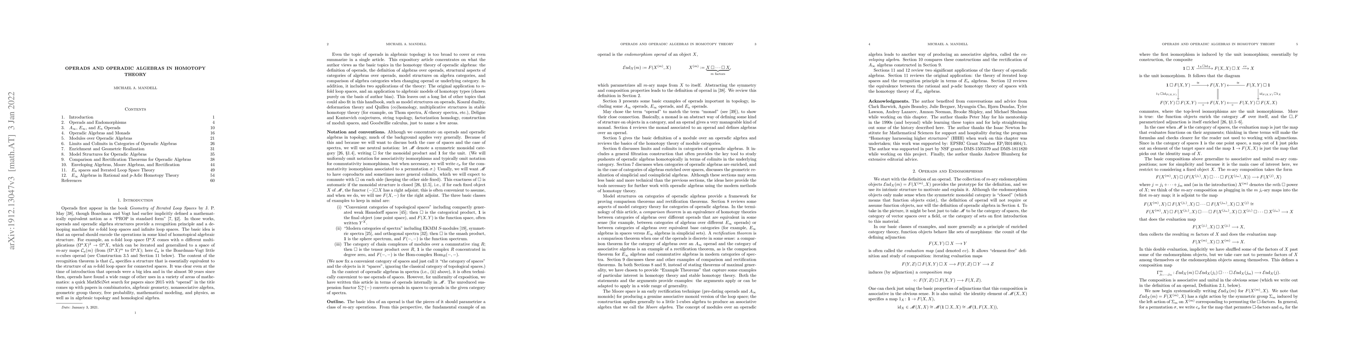 Operads and operadic algebras form a fundamental framework in homotopy theory, providing a structured way to define algebraic objects and their interactions. This expository chapter covers essential aspects including definitions, structural categories, model structures, and applications to loop spaces and homotopy types.