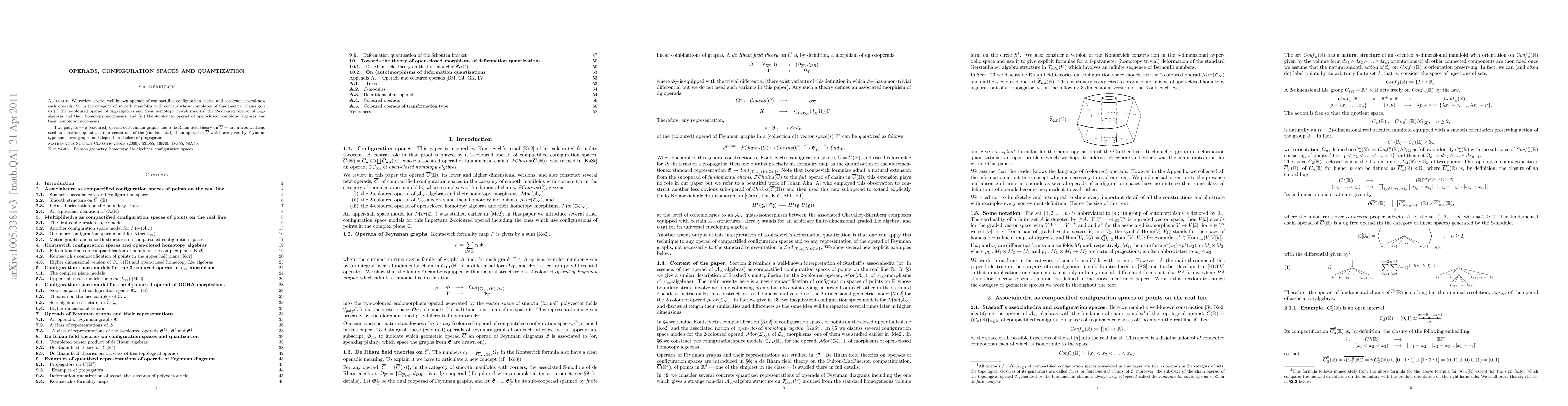 We review several well-known operads of compactified configuration spaces and construct several new such operads, C, in the category of smooth manifolds with corners whose complexes of fundamental chains give us (i) the 2-coloured operad of A-infinity algebras and their homotopy morphisms, (ii) the 2-coloured operad of L-infinity algebras and their homotopy morphisms, and (iii) the 4-coloured operad of open-closed homotopy algebras and their homotopy morphisms. Two gadgets - a (coloured) operad of Feynman graphs and a de Rham field theory on C - are introduced and used to construct quantized representations of the (fundamental) chain operad of C which are given by Feynman type sums over graphs and depend on choices of propagators.