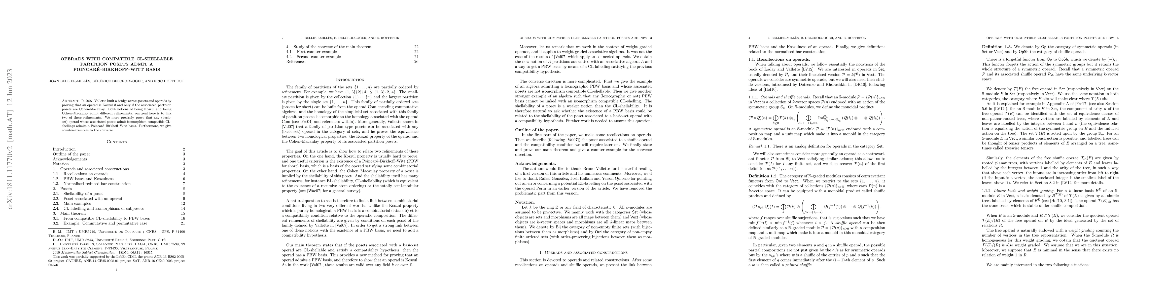 In 2007, Vallette built a bridge across posets and operads by proving that an operad is Koszul if and only if the associated partition posets are Cohen-Macaulay. Both notions of being Koszul and being Cohen-Macaulay admit different refinements: our goal here is to link two of these refinements. We more precisely prove that any (basic-set) operad whose associated posets admit isomorphism-compatible CL-shellings admits a Poincar\'e-Birkhoff-Witt basis. Furthermore, we give counter-examples to the converse.