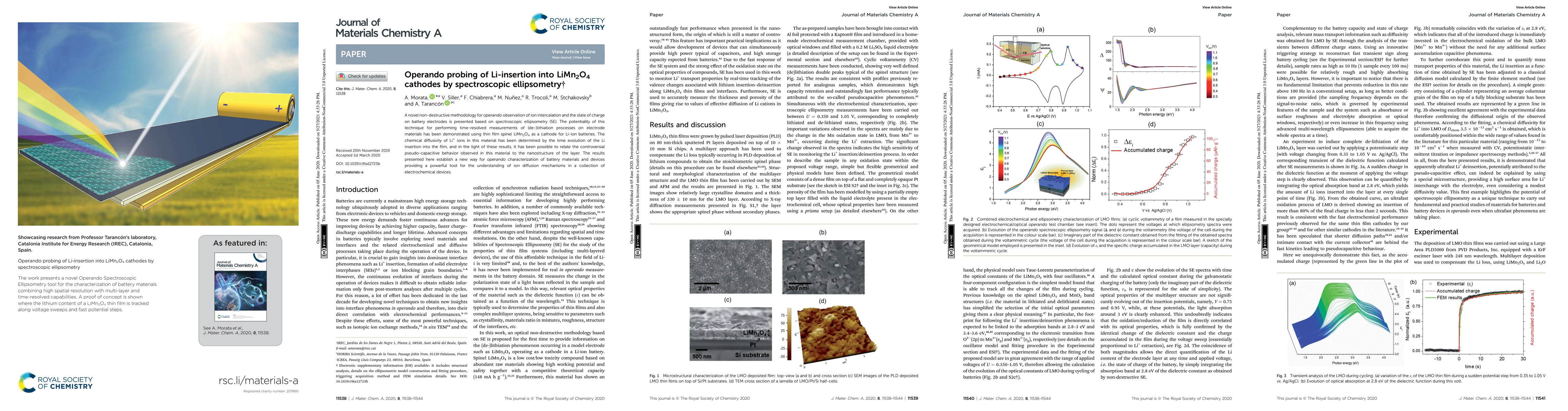 A novel non-destructive methodology for operando observation of ion intercalation and the state of charge on battery electrodes is presented based on spectroscopic ellipsometry (SE). The potentiality of this technique for performing time-resolved measurements of (de-)lithiation processes on electrode materials has been demonstrated using thin film spinel LiMn$_2$O$_4$ as a cathode for Li-ion batteries. The chemical diffusivity of Li+ ions in this material has been determined by the time evolution of the Li insertion into the film, and in the light of these results, it has been possible to relate the controversial pseudo-capacitive behavior observed in this material to the nanostructure of the layer. The results presented here establish a new way for operando characterization of battery materials and devices providing a powerful tool for the understanding of ion diffusion mechanisms in a collection of electrochemical devices.