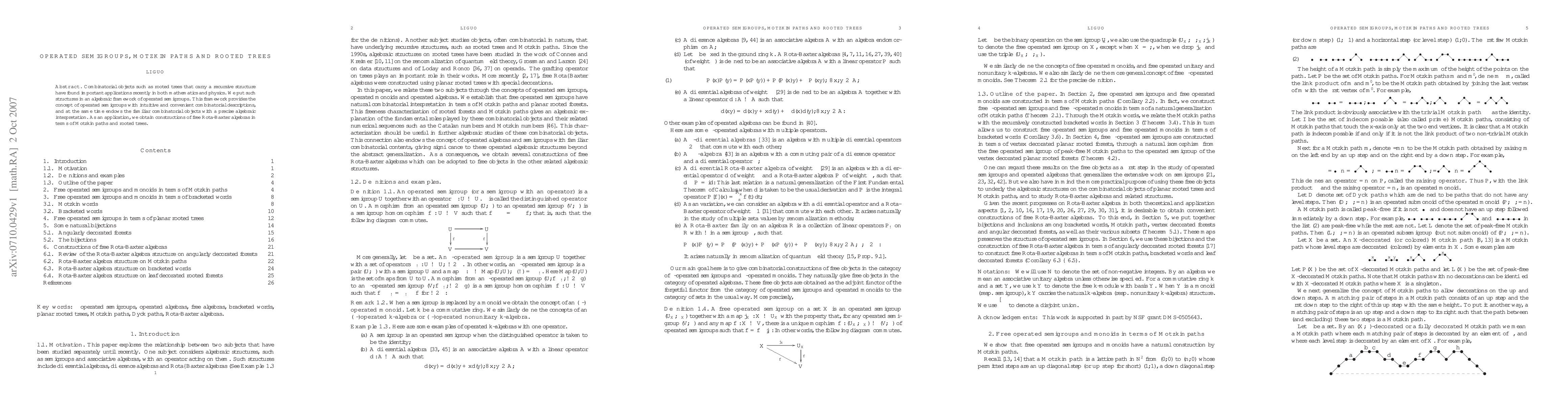 This paper introduces operated semigroups to provide an algebraic framework for combinatorial objects like rooted trees, offering both intuitive and precise interpretations. It also constructs free Rota-Baxter algebras using Motzkin paths and rooted trees within this framework.
