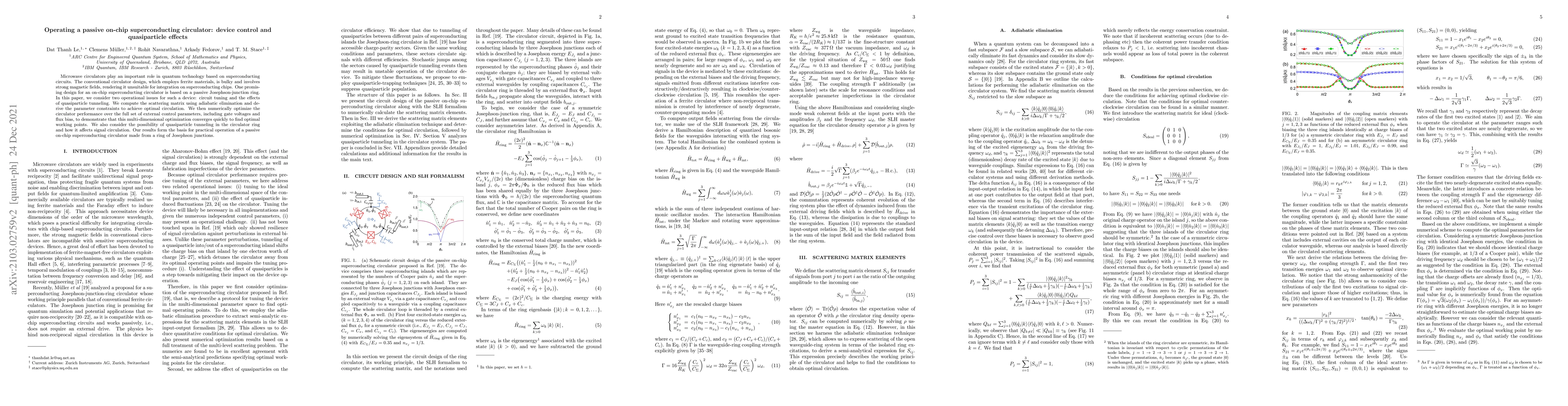 The research employs a combination of theoretical analysis and numerical optimization to investigate the operational aspects of a passive on-chip superconducting circulator based on a Josephson-junction ring. The study uses adiabatic elimination to compute the scattering matrix and derive parameter constraints for optimal circulation, followed by numerical optimization of external control parameters including gate voltages and flux bias.