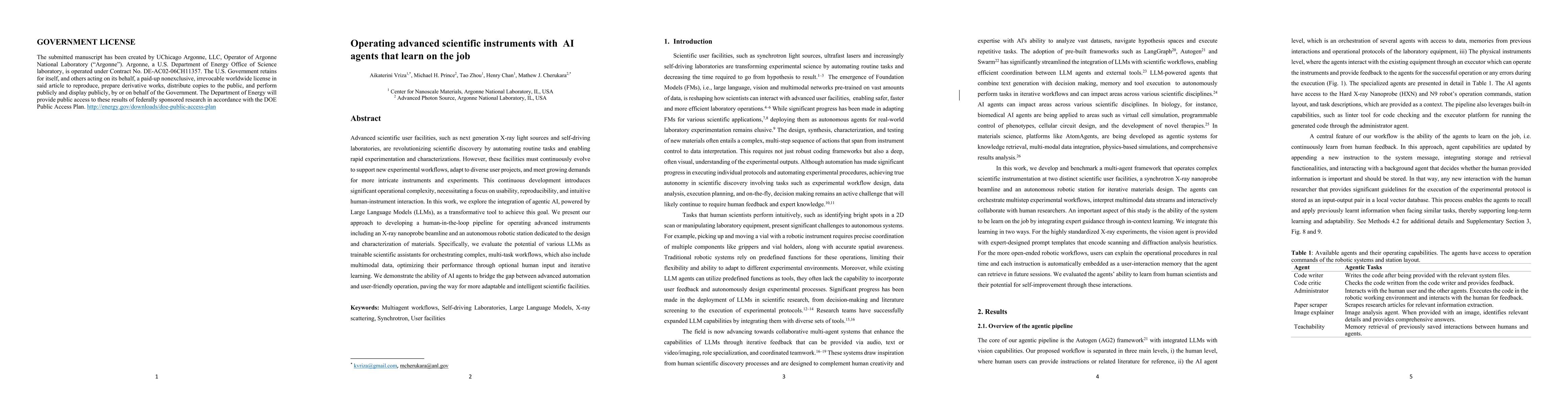 Advanced scientific user facilities, such as next generation X-ray light sources and self-driving laboratories, are revolutionizing scientific discovery by automating routine tasks and enabling rapid experimentation and characterizations. However, these facilities must continuously evolve to support new experimental workflows, adapt to diverse user projects, and meet growing demands for more intricate instruments and experiments. This continuous development introduces significant operational complexity, necessitating a focus on usability, reproducibility, and intuitive human-instrument interaction. In this work, we explore the integration of agentic AI, powered by Large Language Models (LLMs), as a transformative tool to achieve this goal. We present our approach to developing a human-in-the-loop pipeline for operating advanced instruments including an X-ray nanoprobe beamline and an autonomous robotic station dedicated to the design and characterization of materials. Specifically, we evaluate the potential of various LLMs as trainable scientific assistants for orchestrating complex, multi-task workflows, which also include multimodal data, optimizing their performance through optional human input and iterative learning. We demonstrate the ability of AI agents to bridge the gap between advanced automation and user-friendly operation, paving the way for more adaptable and intelligent scientific facilities.