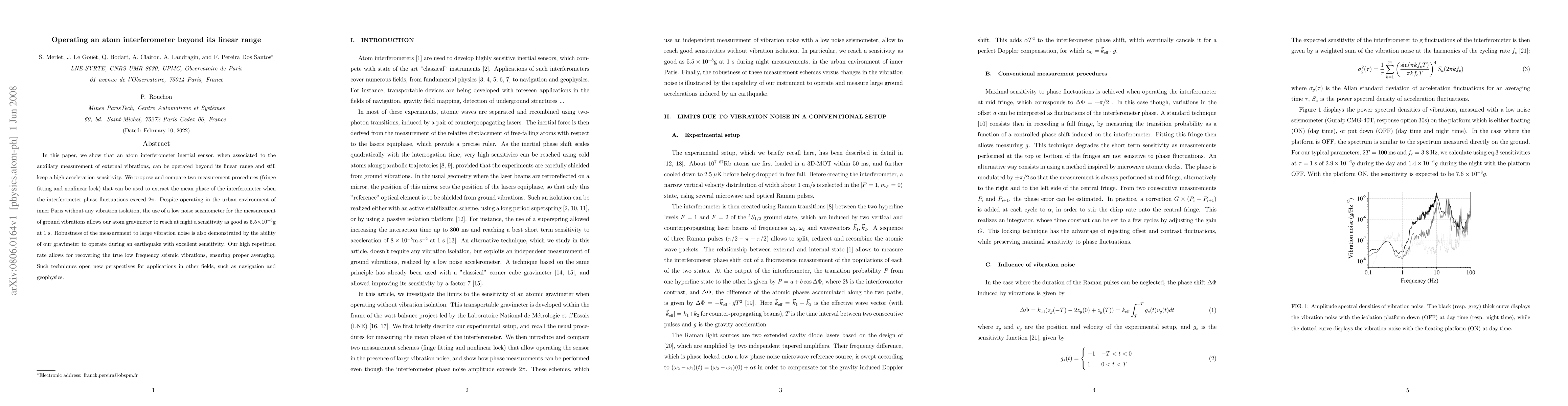 In this paper, we show that an atom interferometer inertial sensor, when associated to the auxiliary measurement of external vibrations, can be operated beyond its linear range and still keep a high acceleration sensitivity. We propose and compare two measurement procedures (fringe fitting and nonlinear lock) that can be used to extract the mean phase of the interferometer when the interferometer phase fluctuations exceed $2\pi$. Despite operating in the urban environment of inner Paris without any vibration isolation, the use of a low noise seismometer for the measurement of ground vibrations allows our atom gravimeter to reach at night a sensitivity as good as $5.5\times10^{-8}$g at 1 s. Robustness of the measurement to large vibration noise is also demonstrated by the ability of our gravimeter to operate during an earthquake with excellent sensitivity. Our high repetition rate allows for recovering the true low frequency seismic vibrations, ensuring proper averaging. Such techniques open new perspectives for applications in other fields, such as navigation and geophysics.