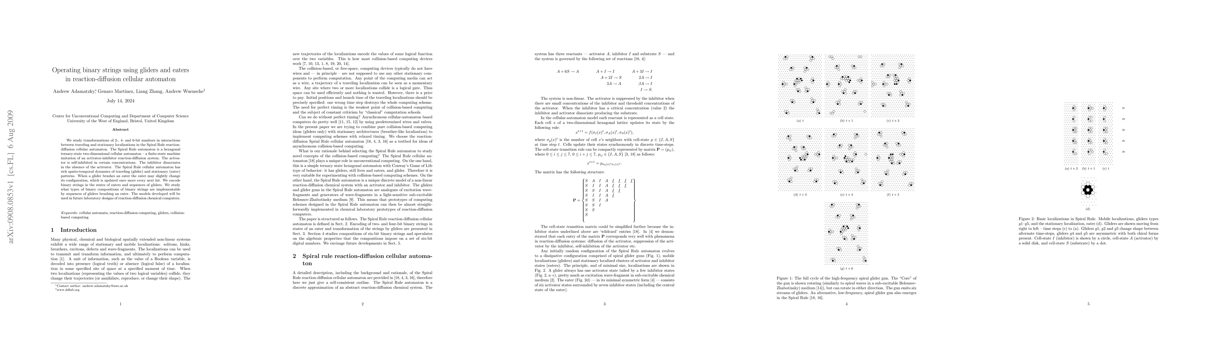 This paper explores transformations of binary strings in the Spiral Rule reaction-diffusion cellular automaton, where gliders and eaters interact to encode and manipulate binary data. The study aims to determine implementable binary compositions using gliders and eater configurations, with potential applications in designing chemical computers.