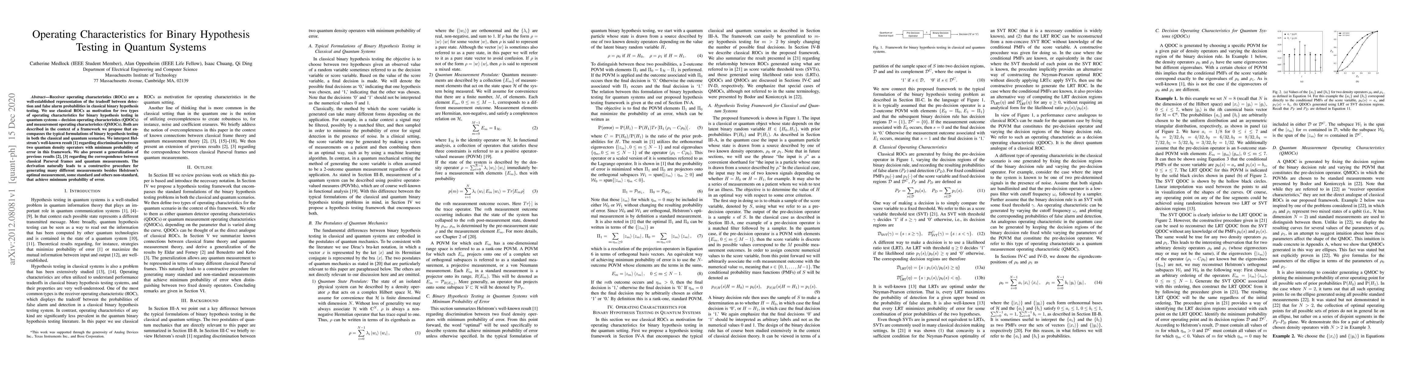 This paper introduces two new operating characteristics, QDOCs and QMOCs, for binary hypothesis testing in quantum systems, extending classical ROCs. It proposes a unified framework for both classical and quantum hypothesis testing and generalizes results on quantum measurements, leading to various optimal measurement procedures.